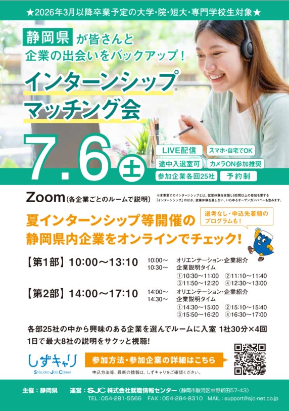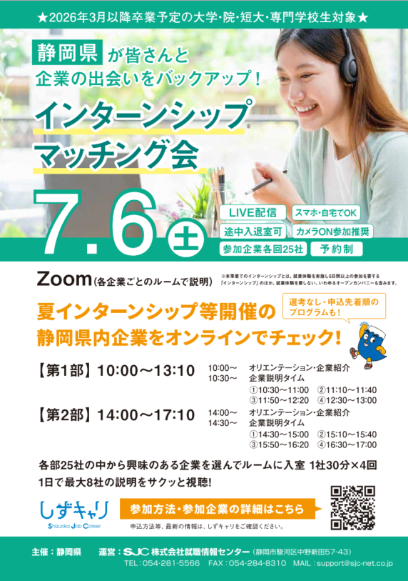 静岡県では、現在大学1~3年生の方など2026年3月以降卒業予定の学生の方を対象として、「インターンシップマッチング会 オンラインLIVE」を開催します。