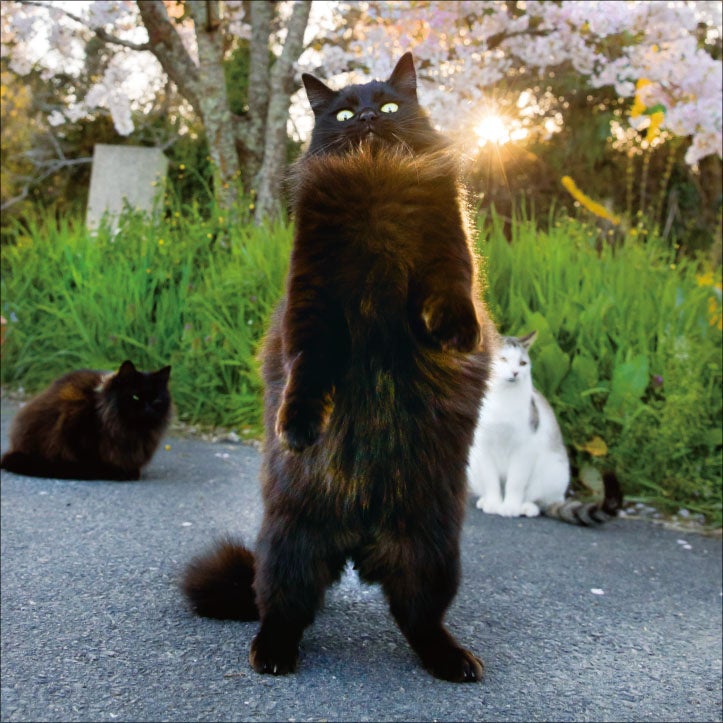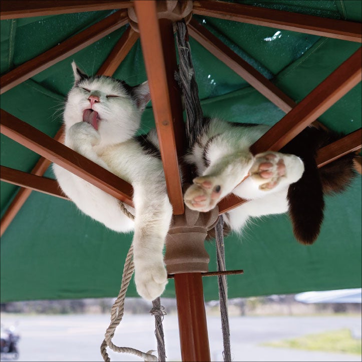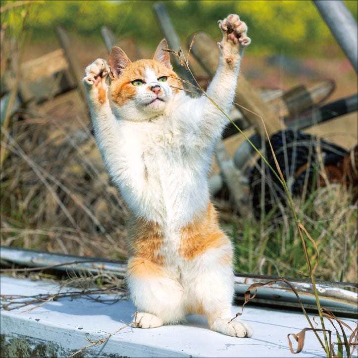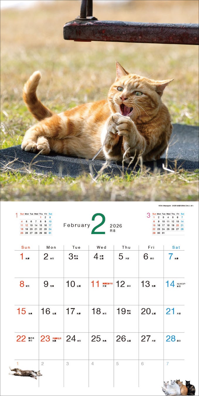 2026年版には、表紙の「イカ耳で駆ける童顔の猫」をはじめ、一心不乱に草を食む猫や、アンバランスな場所で余裕をかましている猫、謎の威圧感で仁王立ちをする黒猫など、一風変わった猫たちの写真が収められています。