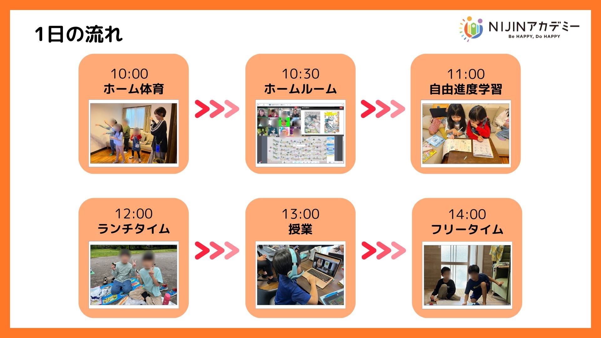 朝9時半に登校する子どもたちは、全国の教室やメタバースと繋がり、「ホーム体育」で身体を動かし、自由進度学習やランチタイム、オンライン授業、全国の友達との部活動・サークルなどを楽しむことができます。