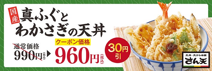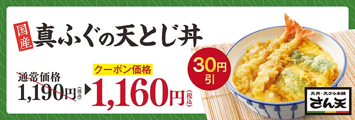 更に「天丼・天ぷら本舗 さん天」公式アプリでは、フェア商品でお使いいただける30円引きクーポンを配信いたします。ぜひ、お得にご利用ください。