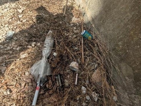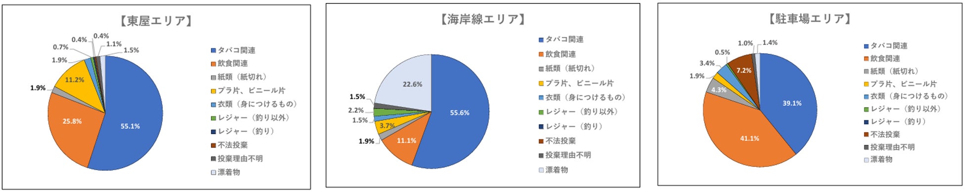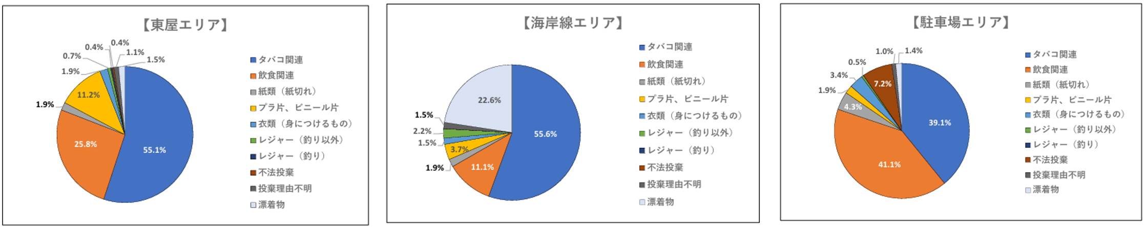 東屋エリアでは267個のごみを確認し、タバコ関連が約55%と最も多く、次いで飲食関連が約26%を占めました。海岸漂着物としては、発泡スチロール片が4個見つかりました。駐車場エリアでは207個のごみを確認し、タバコ関連と飲食関連がそれぞれ約40%でした。発泡スチロール片やポリタンク、漁業用ブイなどの漂着物も3個見つかり、海岸付近で拾われ持ち込まれたものと考えられます。加えて、袋ごみが13個確認されました。海岸線エリアでは270個のごみを確認し、タバコ関連が約56%と最も多く、次いで海岸漂着物が約23%、飲食関連が約11%となりました。漂着物は61個あり、主に発泡スチロール片とプラスチック片でした。