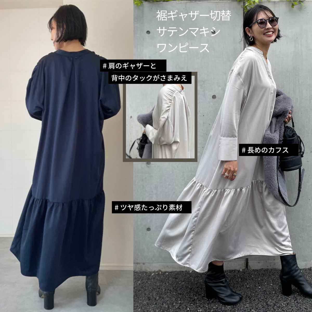 商品名:裾ギャザー切替 サテンマキシワンピース【ニッセン×うえむらあやの】