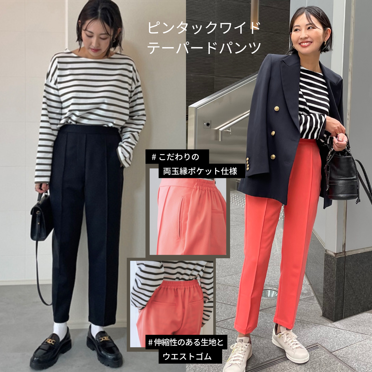 ヒップ&太ももまわりはゆったり、裾に向かって緩やかにすぼんだトレンドの太めテーパードが気になるところをおしゃれにカバーしてくれます。このラインが一番のこだわりポイントです!切り口をパイピング処理した丁寧な縫製のポケットがきちんと感を演出。センタープレスだと洗濯すると取れてしまいますが、洗濯を繰り返してもきれいなシルエットが長続きするピンタックをいれることで美脚見えも叶えます。