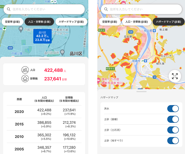 ・楽待の人気機能「賃貸経営マップ」のアプリ版に、「人口・世帯数」「土砂災害ハザードマップ」が確認できる機能が追加された