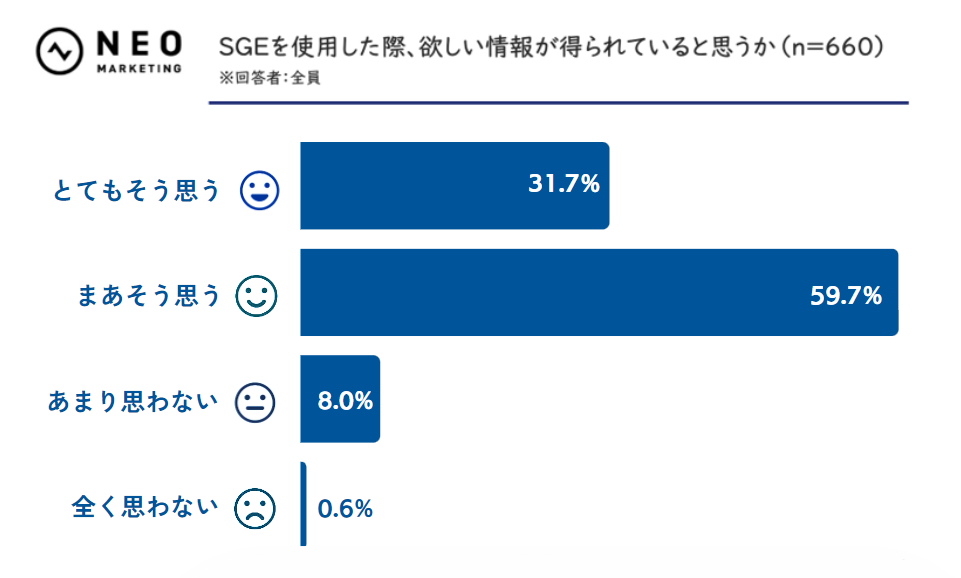 SGEが、“一度の検索でユーザーが欲しい情報を即座に導き出す”というだけでなく、“その背後にある意図や文脈を理解した情報提供を目指している”ことを踏まえると、現状の使用実態にはまだまだ課題が多いと言えそうです。