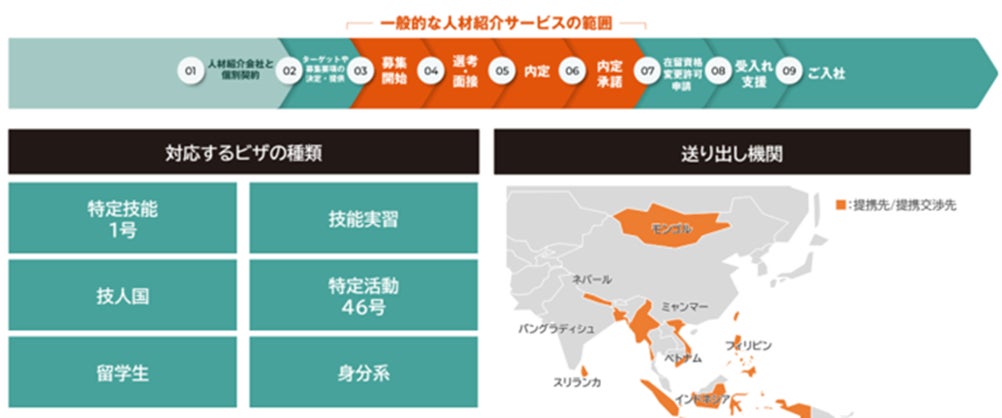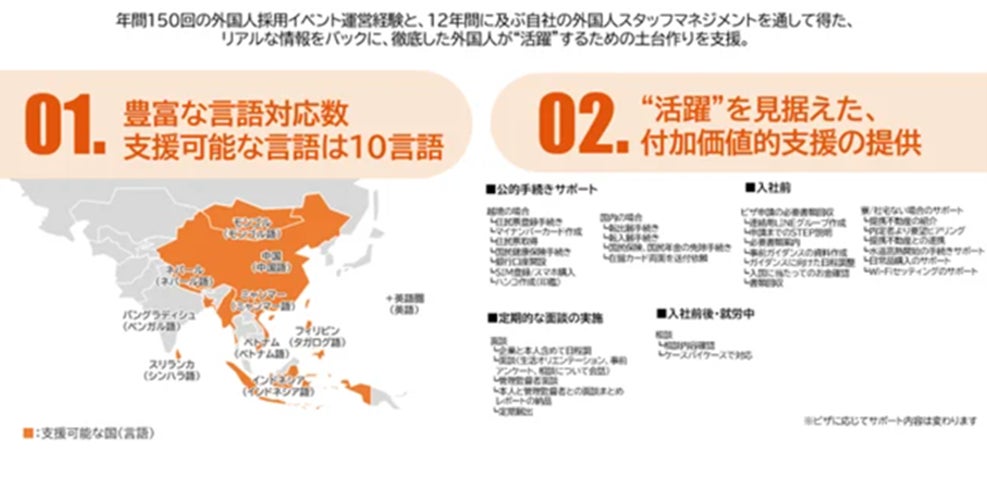 どの国の人材でも対応できる体制を構築。入社前のビザ申請や入社準備、居住サポートから、入社後の個別サポート、受入れ側への支援まで幅広く対応します。せっかく入社してもすぐ退職してしまっては意味がないため、定着に向けてしっかり伴走します。これにより、企業の人事担当者の負担が軽減され、最適なマッチングと即戦力化を実現できます。
