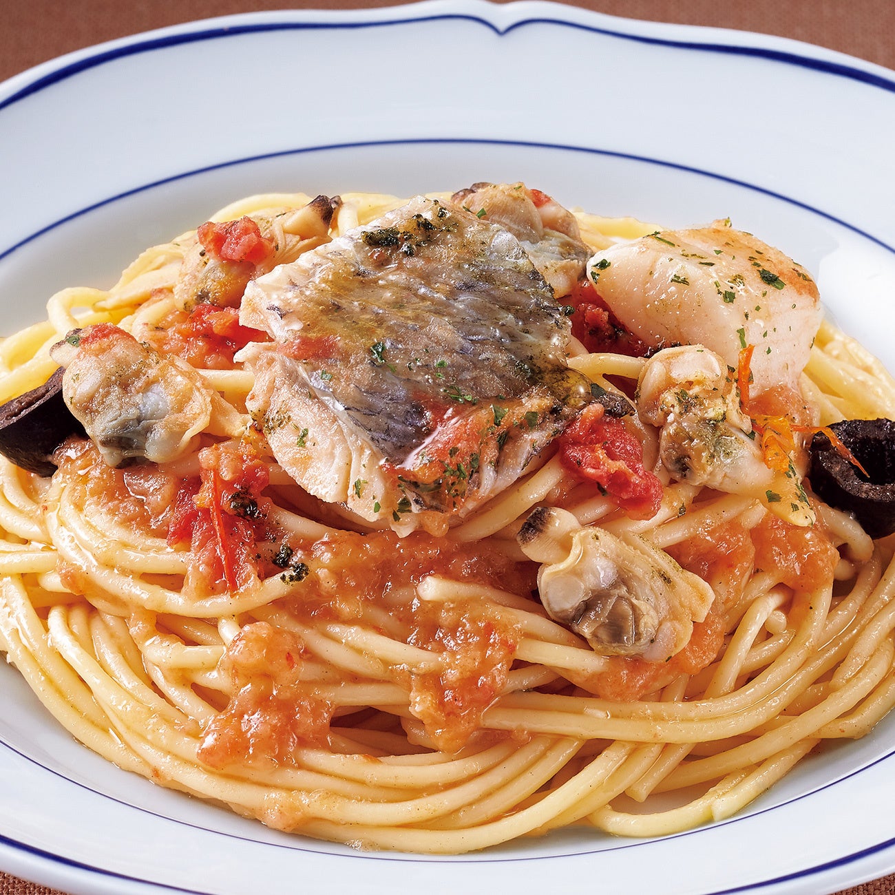 北海道産のほたて貝柱をはじめ、真鯛、あさりなど贅沢な海の幸を取り入れた食べごたえ満点のシーフードスパゲッティ。ドライトマトのやさしい酸味と甘さが魚介ベースのソースと絶妙に調和しています。一年の締めくくり、特別な日の食卓にも相応しいメニューです。