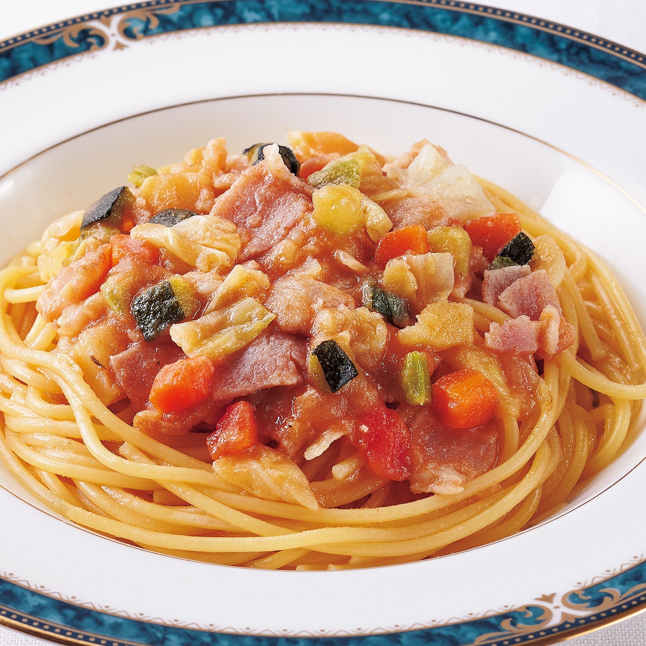 イタリアの家庭料理ミネストローネをアレンジした、見た目も鮮やかな一品です。ズッキーニ、じゃがいも、人参、グリルトマトなど様々な野菜が入って食べごたえは充分。ベーコンの塩味はトマトベースの酸味とよく合います。