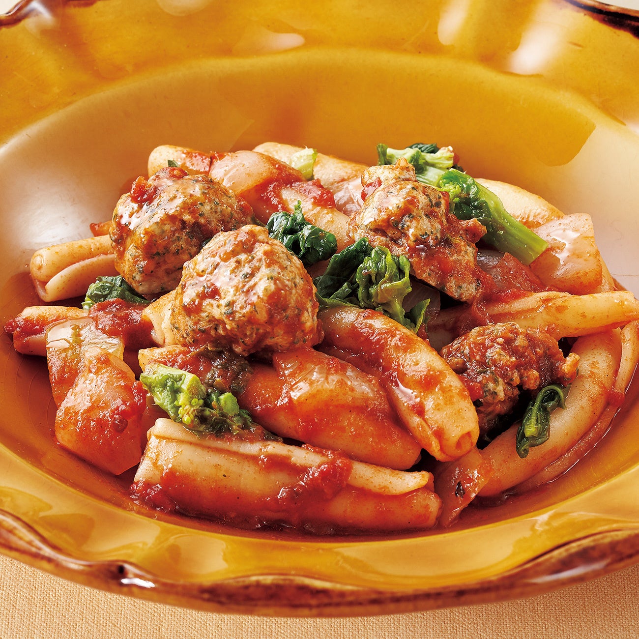 レモンの風味が漂うポルペッタは、イタリア生まれの団子料理。イカ、にんにく、パセリの味がバランスよくまとまって、互いの個性を引き立てています。くるんと丸まったショートパスタのカヴァテッリに、トマトソースをたっぷり絡めてお召し上がりください。