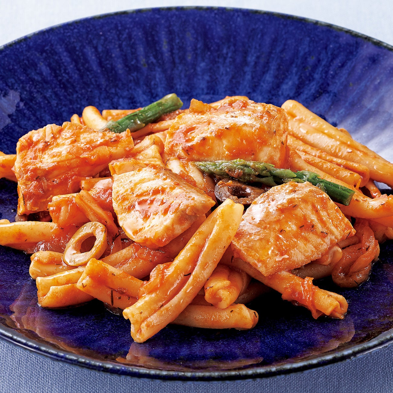 旨みのある鶏もも肉に、グリルポテト、赤と黄のピーマン、人参など野菜をたっぷり加えたカチャトーラ。トマトの爽やかな酸味に赤ワインビネガーを合わせ、すっきりした味わいに仕立てました。イタリア語で“蝶々”を意味するファルファッレはくぼみにソースがよく絡み、美味しさもひとしおです。