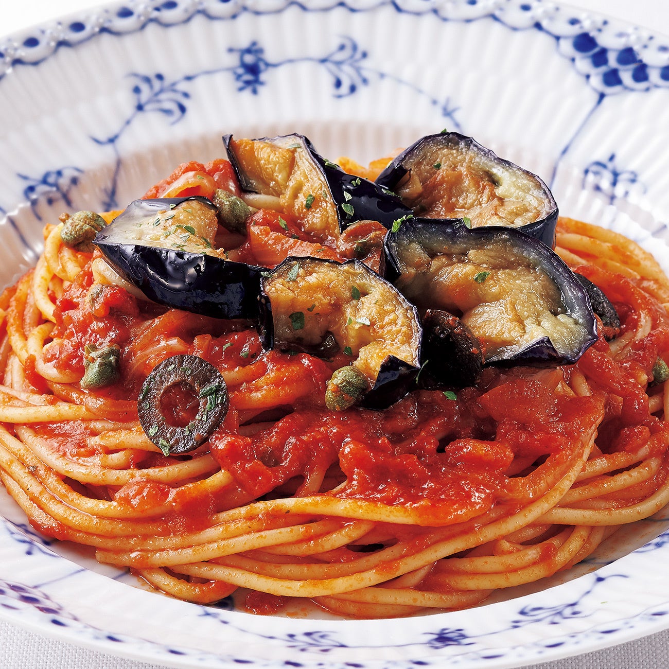 ナポリの古典的なソースとして知られるプッタネスカ。暑い季節にぴったりな茄子は、オリーブオイルでサッと素揚げすることで旨みをとじこめています。塩漬けした濃厚なアンチョビやケッパー、オリーブをトッピングし、伝統料理とはひと味違う〈Piatto Suzuki〉流の味わいに。