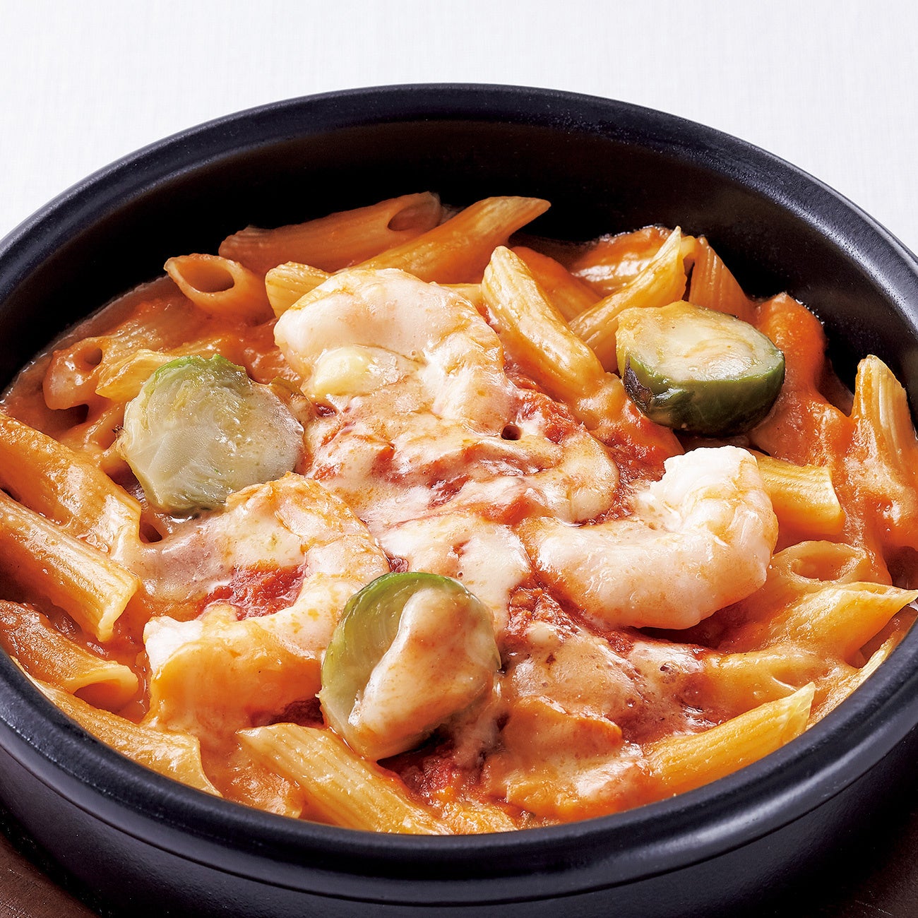 焙焼した海老の頭を煮込んでコクを出したアメリケーヌソースと、ホワイトソースを混ぜ合わせた本格グラタン。とろっとした熱々のチーズに海老や芽キャベツを絡ませて、濃厚な美味しさをぜひお愉しみください。