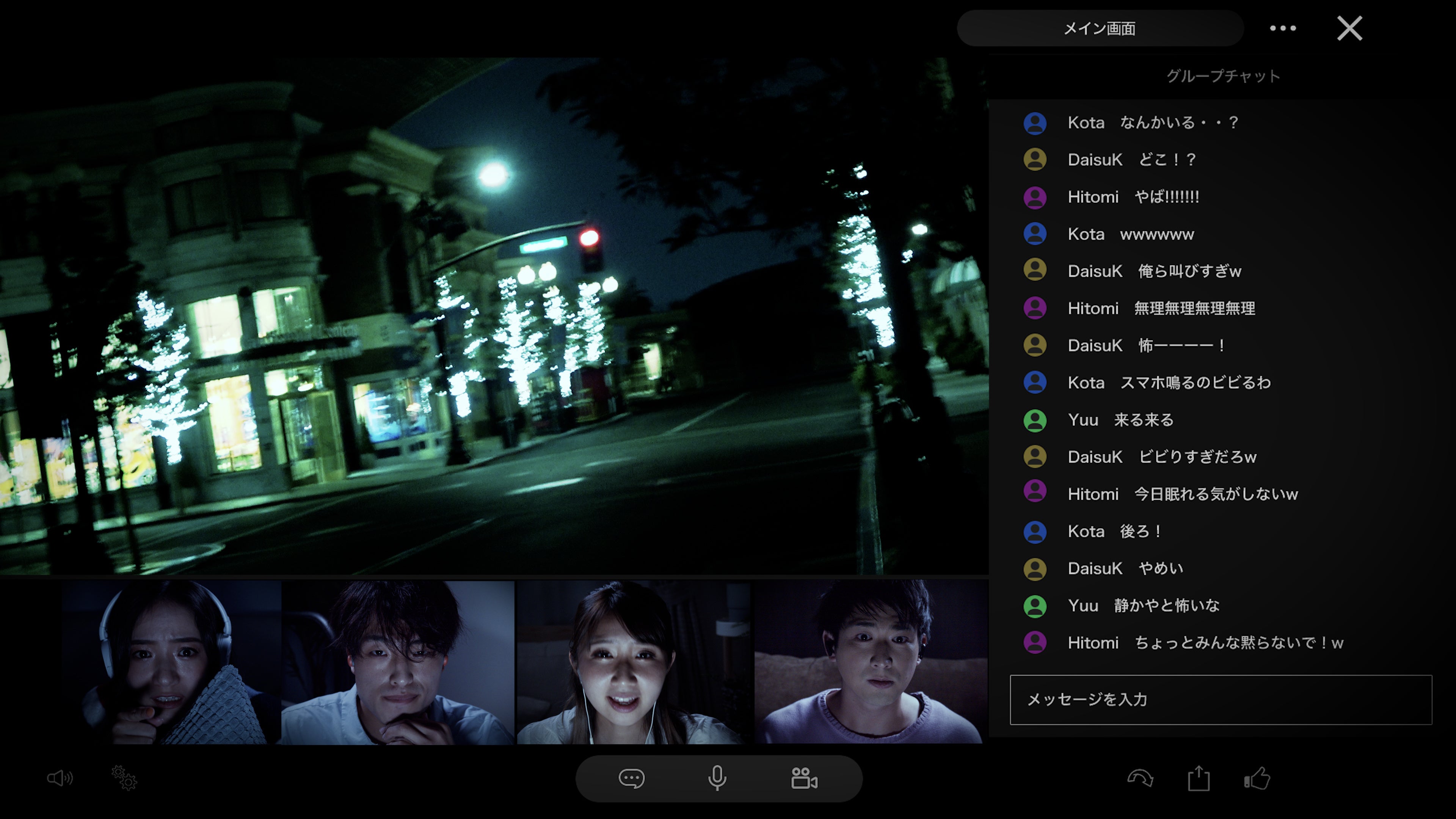 真夜中のパークで行われるツアーを、オンラインで見るだけでなく、グループチャット機能やビデオ通話を通して、仲間と知恵と力を合わせたり、リアルタイムで気持ちやリアクションを共有しながら、予想外の展開や驚愕のホラーギミックを仲間とともに乗り越えて、絆を深めるグループ参加型※のオンライン・イベントです。当イベントは、これまでパークへ来場したことがある方はもちろん、パークに来場したことのない方でも楽しめるコンテンツです。パークに来場したことのある方は、閉園後の真夜中のパークという今まで見たことのない景観の中で繰り広げられるホラーによって、想像力が掻き立てられ、まるでその場にいるかのような臨場感たっぷりのホラー体験をお楽しみいただけます。また、パークに来場したことのない方も、これまで数々のリアルホラーエンターテイメントをお届けしてきたユニバーサル・スタジオ・ジャパンが誇る、圧倒的没入感による本格的なホラー体験を存分に味わっていただけます。