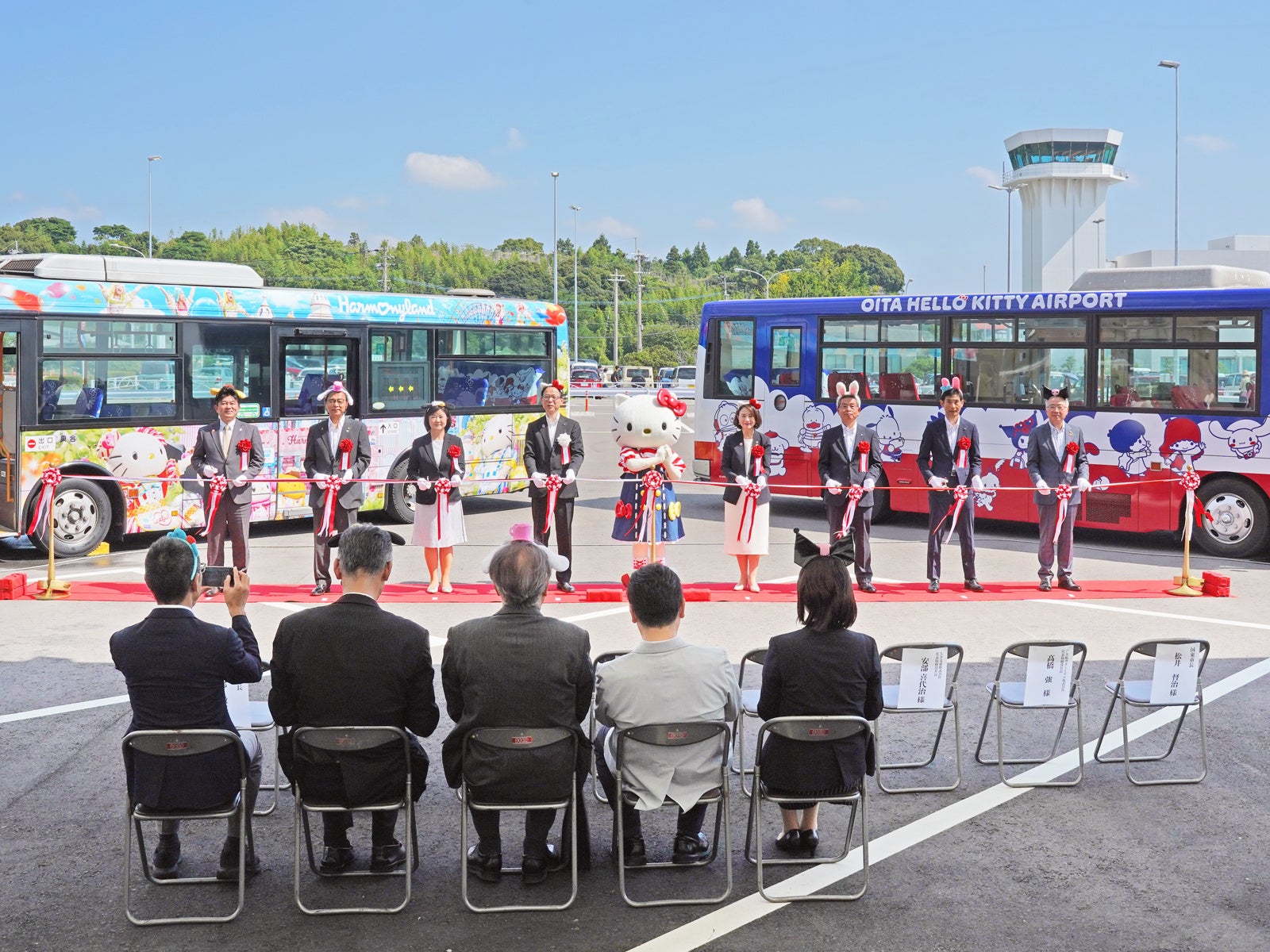 株式会社サンリオエンターテイメント(本社:東京都多摩市、代表取締役:小巻亜矢)は、 大分県(知事:佐藤 樹一郎) と 大分交通株式会社(代表取締役社長:安部 喜代治)とともに、2025年8月2日(土)に「大分ハローキティ空港」 と「ハーモニーランド」を結ぶラッピングバス“ハーモニーライナー”の運行開始を記念して、出発式を開催しました。当日は、お祝いにかけつけたハローキティとテープカットを実施。ご来賓のみなさまと共に運行をお祝いしました。