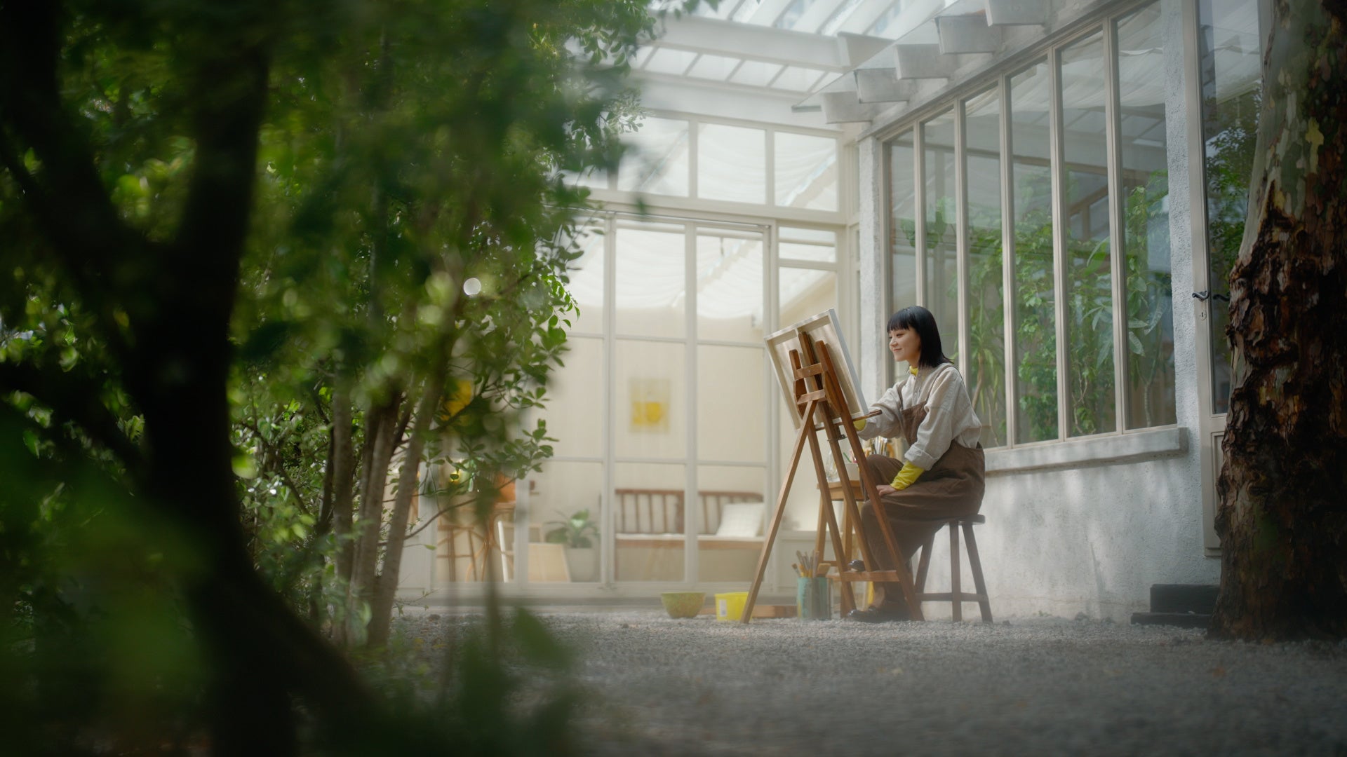 舞台は、「ディアボーテ HIMAWARI」のCMキャラクター「奈緒」のアトリエ。柔らかい日の光の中でリラックスした様子で、少女のイラストを描いています。