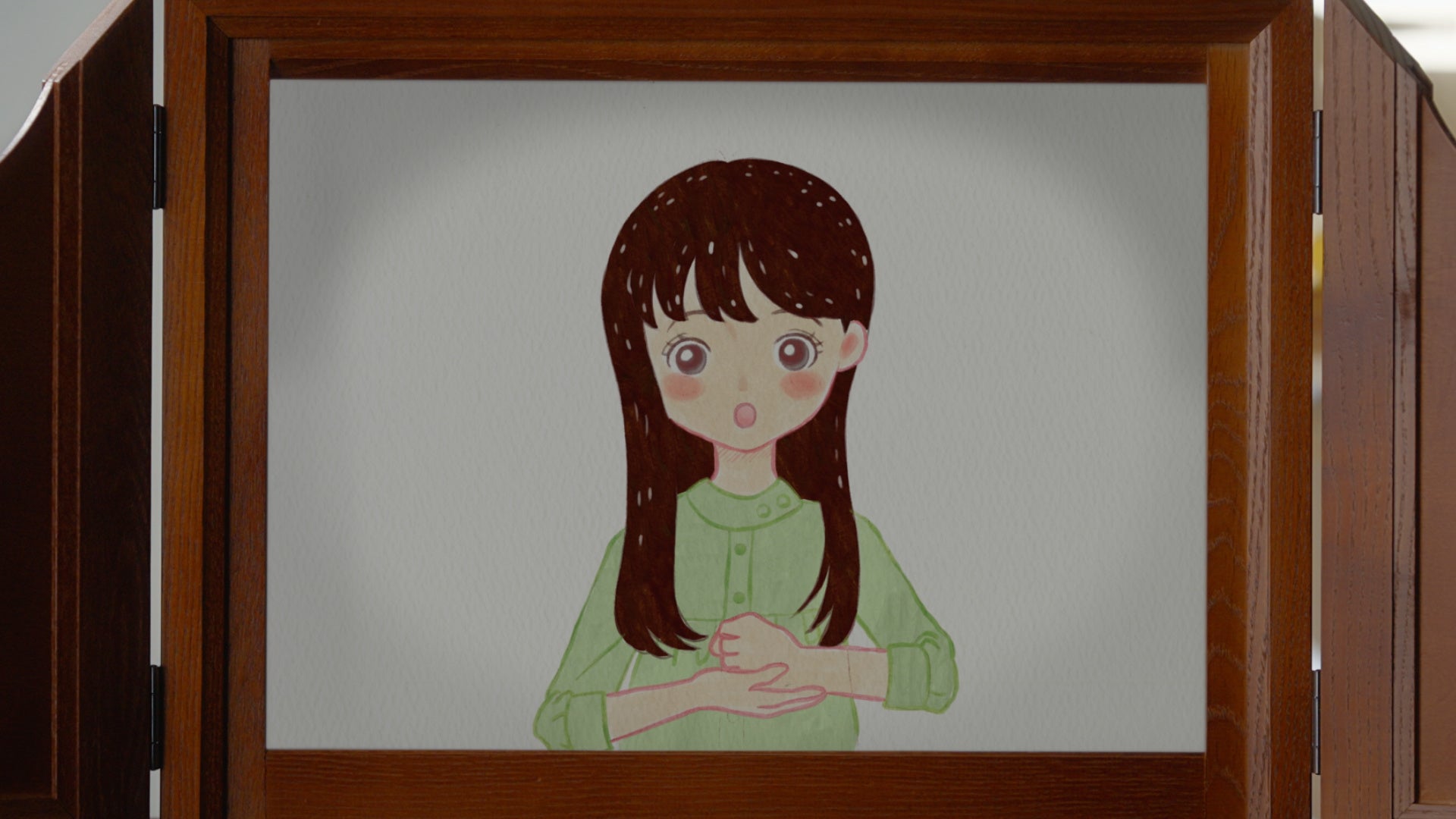 出来上がったイラストに満足した「奈緒」は、微笑みながら、気分良くレコードで音楽をかけて、名作童話の紙芝居のように読んでみることにします。すると、イラストの少女が動き出し、「髪芝居」がスタート。髪のうねりやくせ、パサつきや広がりで悩む少女に、「奈緒」はそれらの原因が「髪のゆがみ」にあることを教えます。