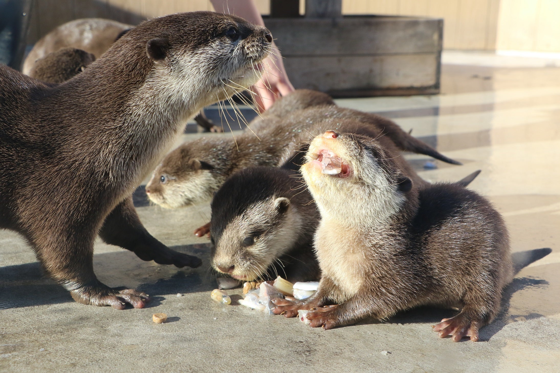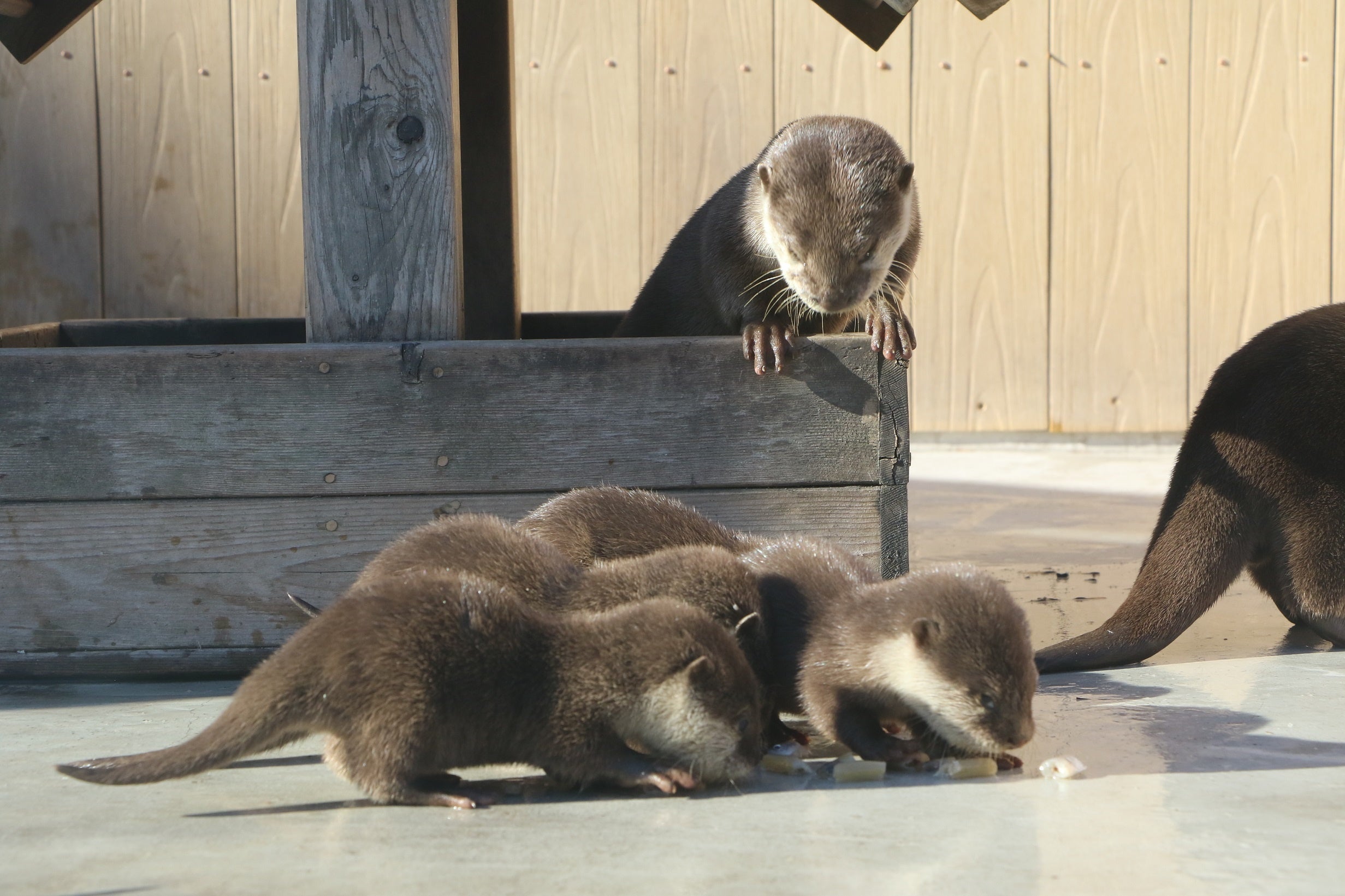 コツメカワウソの赤ちゃんは、生後2か月半が経ち、現在は一般公開に向けて展示室に出る練習をしております。お母さんの「ムーア」とお父さんの「レラキ」に連れられ、よちよち歩きながら展示室と寝室を行ったり来たり。展示場内を歩き回ったり、魚を食べる練習なども行っています。ごはんの時間には、お母さんやお父さん、昨年2月に生まれたお姉さんが、赤ちゃんにごはんを渡す微笑ましい家族愛を見ることができます。