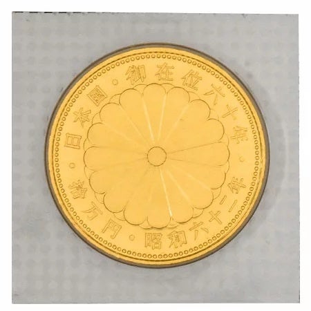 昭和天皇の御在位60年を記念して2回発行された、日本初の「記念金貨」になります。発行枚数は、昭和61年1000万枚、昭和62年100万枚。参考として当時の販売価格は、11万7300円(昭和62年度)、プルーフ金貨12万6500円(昭和62年度)