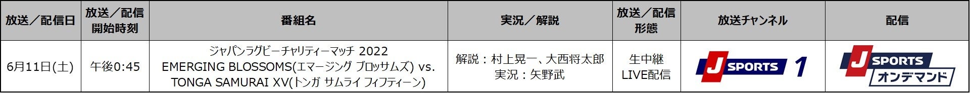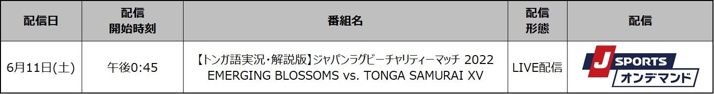 国内最大4チャンネルのスポーツテレビ局、株式会社ジェイ・スポーツ(本社 東京都江東区、代表取締役社長 長谷 一郎、以下「J SPORTS」 ※1)は、 6月11日(土)に東京・秩父宮ラグビー場にて開催されるトンガ復興支援チャリティーマッチ「ジャパンラグビーチャリティーマッチ 2022 EMERGING BLOSSOMS(エマージング ブロッサムズ) vs. TONGA SAMURAI XV(トンガサムライ フィフティーン)」戦のトンガ語実況・解説版をPC、スマホ、タブレットで見られる動画配信サービス 「J SPORTSオンデマンド」※2でLIVE配信いたします。