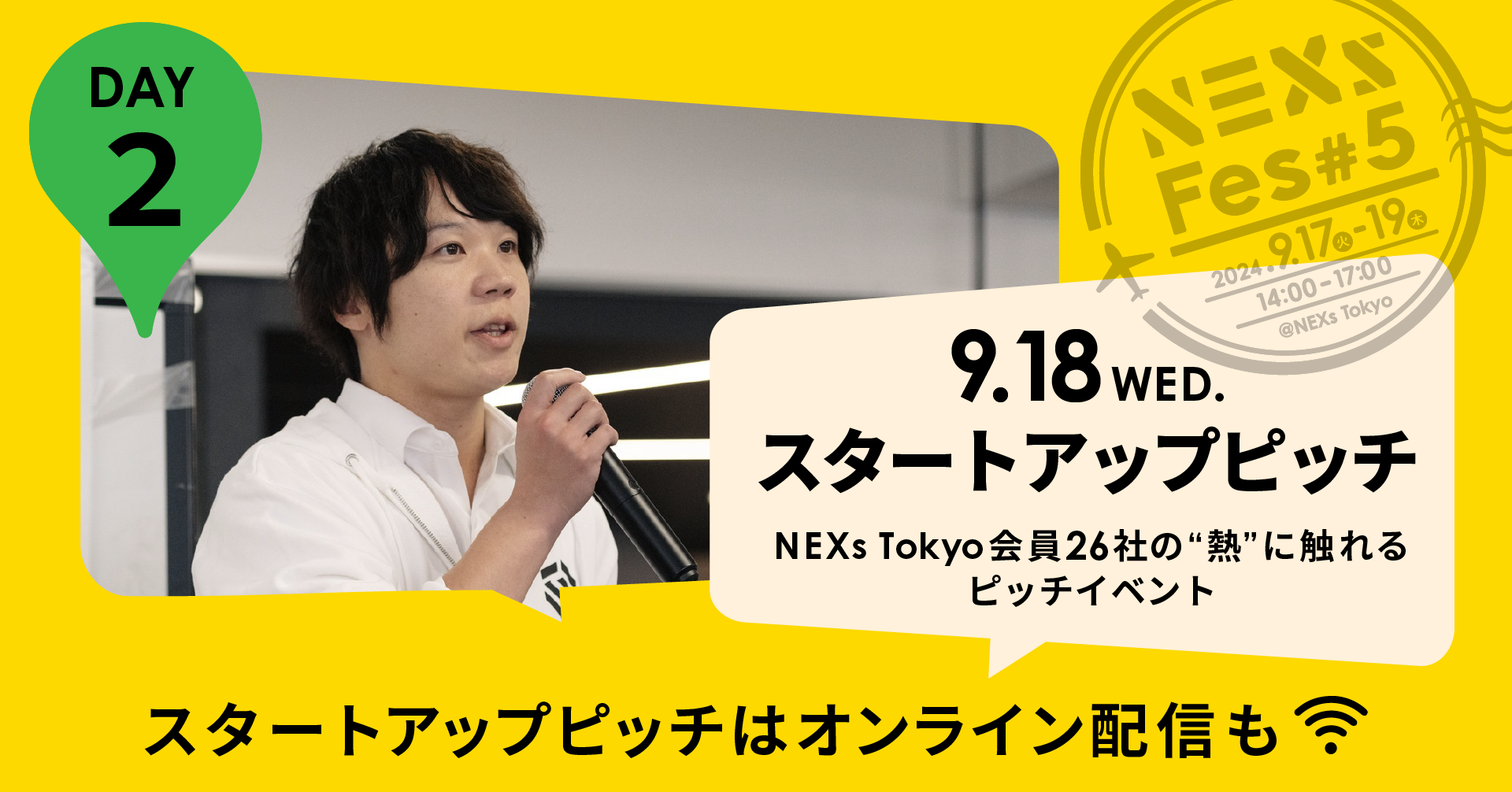 9月18日(水)のDAY2は「NEXs Tokyoスタートアップ会員ピッチ」が開催され、総勢26社が【地域創生】、【ヘルスケア】、【教育】、【アグリ・フード】、【ロボティックス】の5つのテーマに分かれ、それぞれの事業について、それぞれが事業にかける思いについて、NEXs Tokyo現地でピッチを行います。