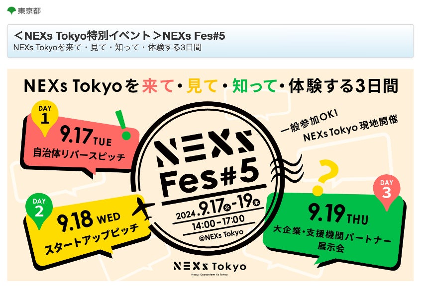 本イベントは、東京都が運営する業種・業界・地域を超えて挑戦するスタートアップエコシステムのための事業「NEXs Tokyo」が、本事業のコミュニティスペースにて全国のスタートアップと事業展開パートナーが一堂に介するリアルイベント「NEXs Fes #5」として開催するものです。