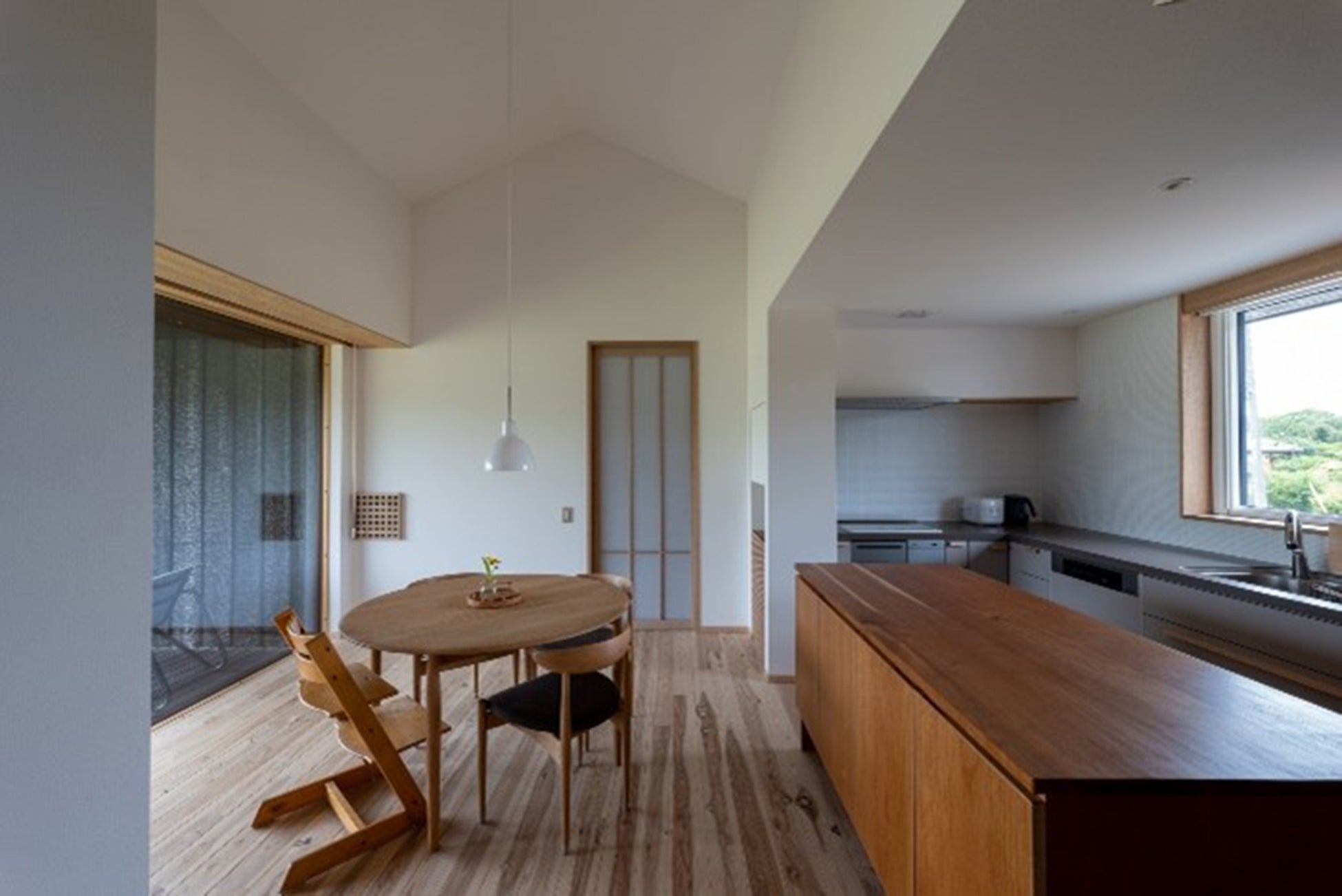 建主が生まれ育った土地であるという、のどかな里山の風景を十分に生かした住まい。あえて東向きに構えたダイニングの開口からは美しい眺めが広がり、「いい景色と暮らしていきたい」という強い意思が感じられる。戸外とゆるやかにグラデーションでつながる外構も魅力的。空間の納まりが美しく、高い設計力が感じられる。日当たりのよさと美しい景色を天秤にかけ、景色を取ったという設計者の潔い気持ちを尊重したい。