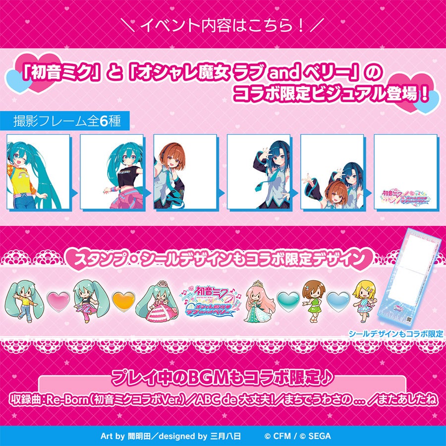 実施内容 :「初音ミク×オシャレ魔女 ラブ and ベリー」コラボ限定の撮影フレーム全6種、スタンプ全11種、コラボ限定シールデザインが登場するほか、プレイ中に聴けるBGMにはコラボ限定曲が全4曲追加されます。