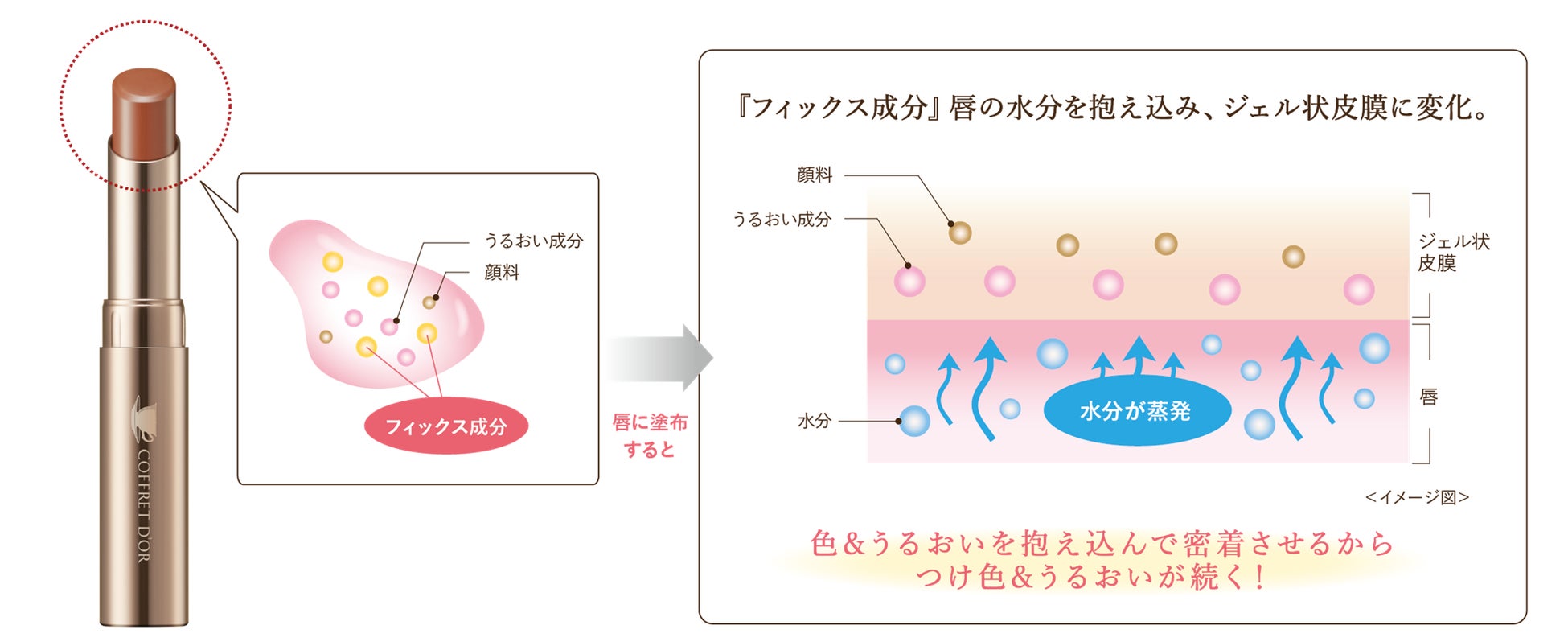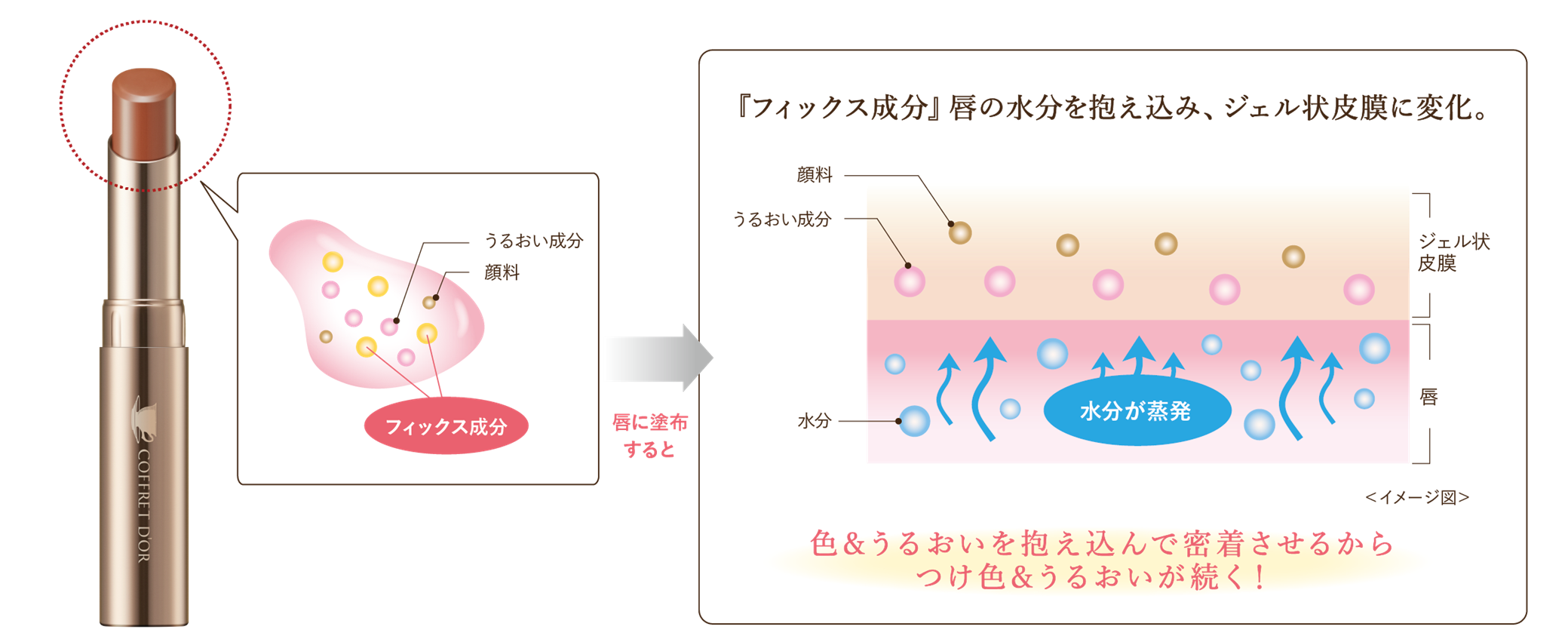 唇の水分を抱え込み、ジェル状皮膜に変化させる「フィックス成分」が、製品に含まれる顔料(色)とうるおい成分を抱え込んで密着させることで、つけ色が長時間持続します。