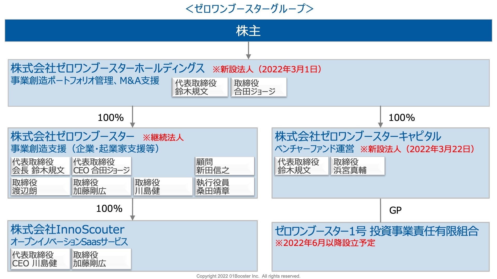 10周年を迎え、「日本を事業創造できる国にする」ミッションをさらに加速するため、従来事業株式会社ゼロワンブースターについては共同創業者合田ジョージをCEOとし、ファンド事業株式会社ゼロワンブースターキャピタルを含めた株式会社ゼロワンブースターホールディングスによるグループ経営で「世界を変えて」まいります。