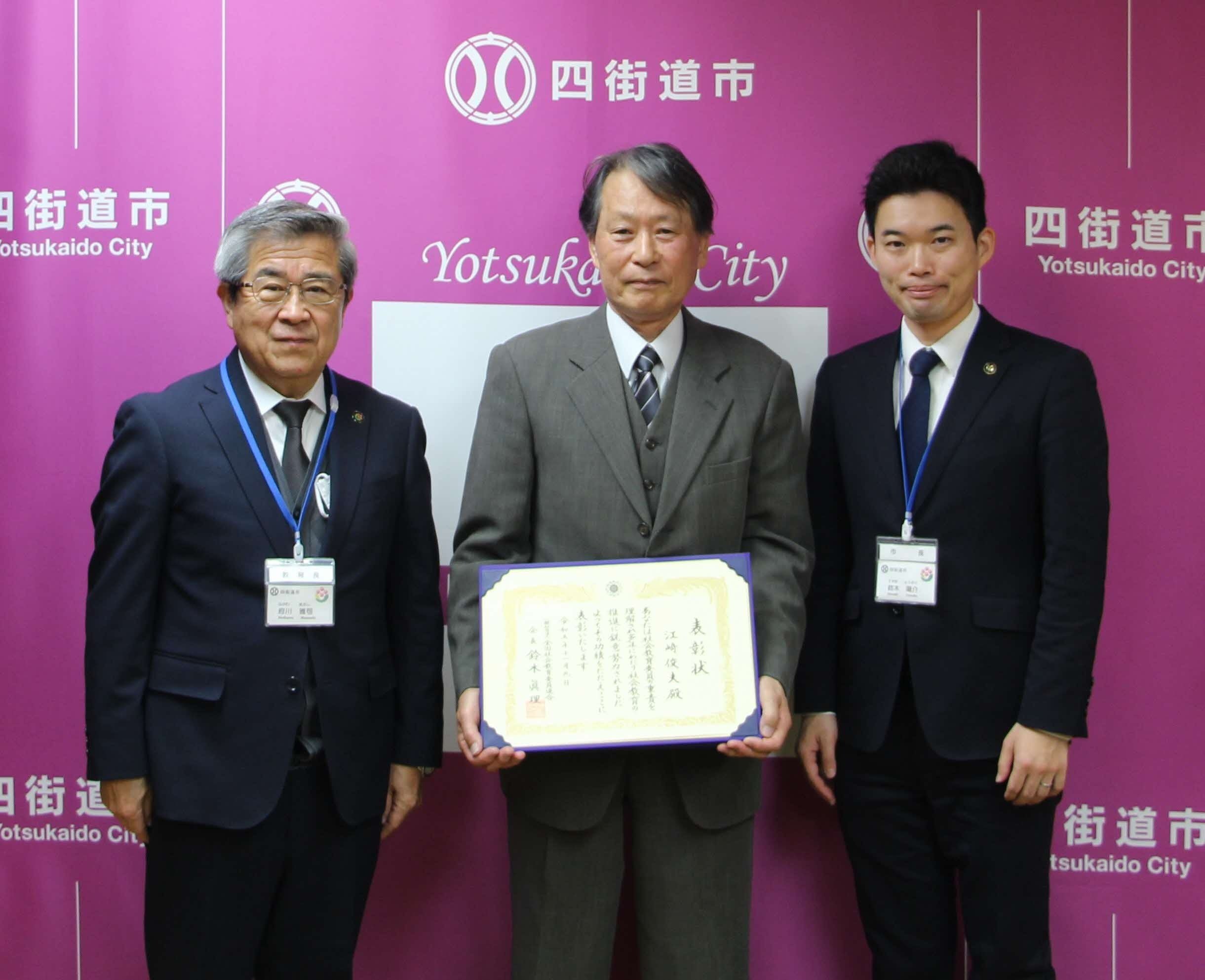令和5年11月9日に宮崎県で行われた第65回全国社会教育研究大会において、社会教育の振興発展に尽力した功績をたたえられ、令和5年度全国社会教育委員連合表彰を受賞された江﨑俊夫さんが、四街道市長を表敬訪問しました。