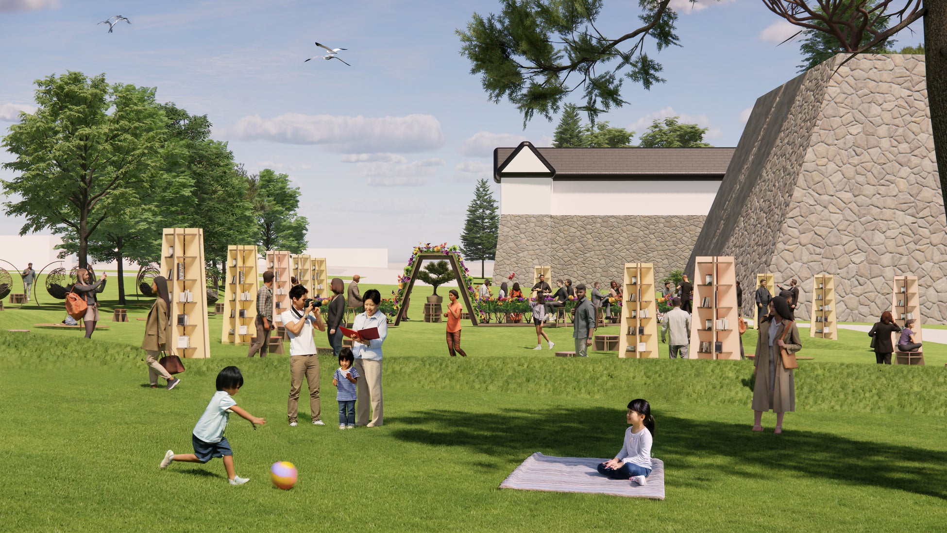 日本建築は長らく、グリッドや幾何学に基づいて築かれてきました。柱のグリッドは日本建築の歴史を形作り、現代建築にも世界的な影響を与えています。本プロジェクトでは、佐賀城跡の構想図に基づき、このグリッドを通して佐賀城を拡張し、再び生き生きとさせる挑戦に取り組みました。10×10メートルのグリッドシステムは没入型の体験を提供し、柱には書籍が収められています。これらは知識の象徴であり、佐賀の古の力を示しています。この新たな都市空間の中で、訪れる人々は佐賀城を新たな視点で体験し、ランドスケープのクライマックスとなるフラワーテーブルにたどり着きます。全長15メートルのこのテーブルは、城壁の形に沿って配置され、過去と現在をつなぐポータルを形成します。佐賀さいこうフェスに参加される方に、歴史的栄華の壮麗さを体験していただけることを願っています。