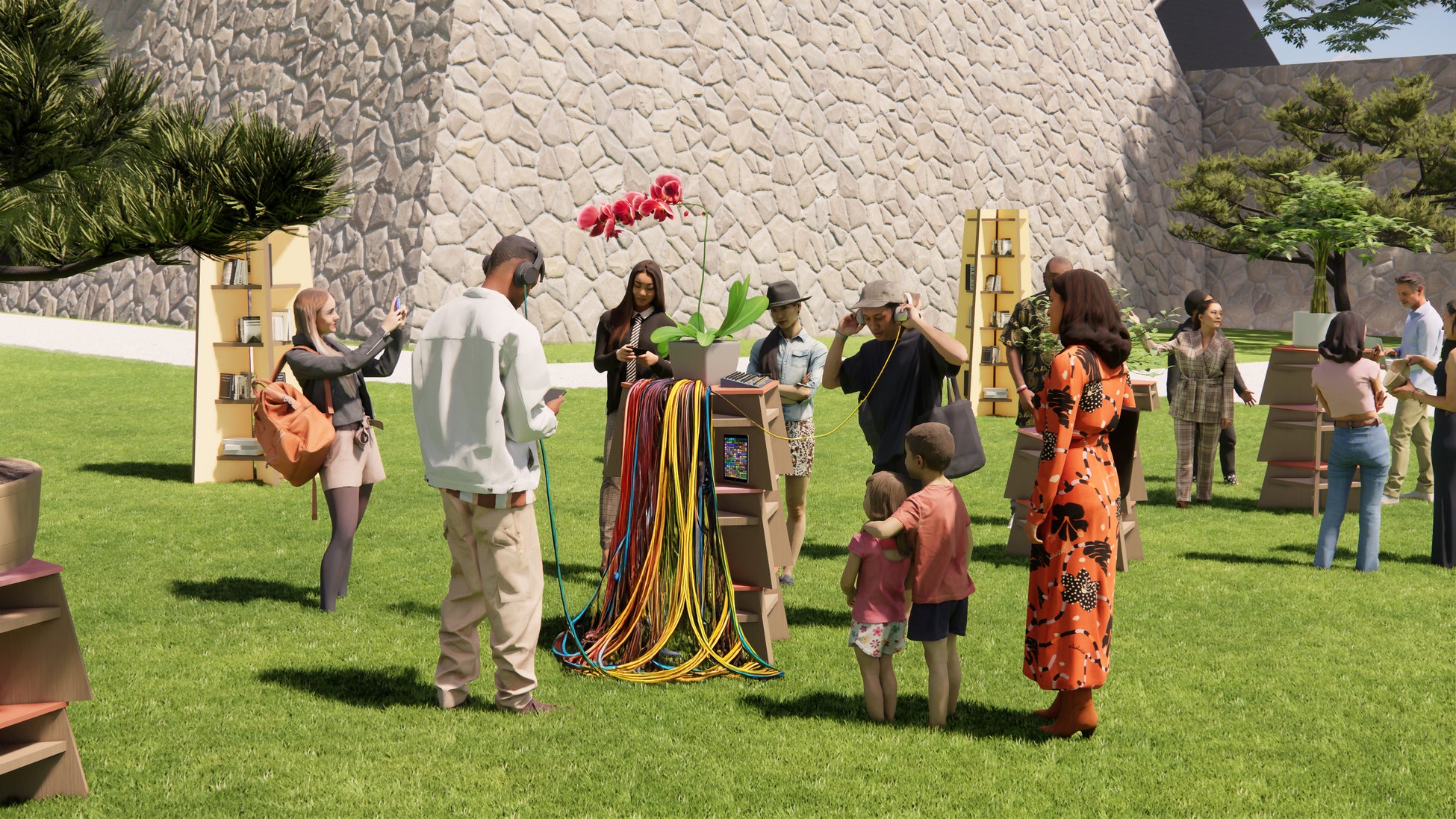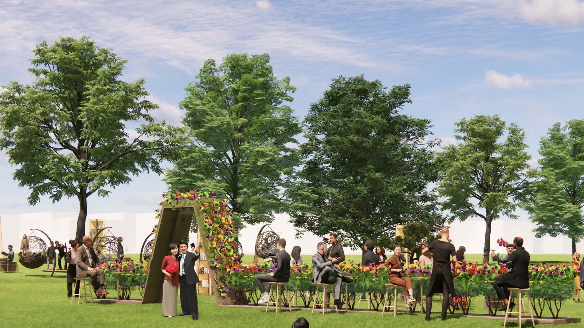 佐賀県鹿島市出身で新進気鋭のフラワーアーティスト松本光氏の全面協力により、今回のためにデザインし生み出された、約8,000本の生花が咲き誇る約15mの巨大アートテーブルが登場。さらに、花が音を奏でるインタラクティブアート、そして本棚やスツールなどのくつろぎの空間が広がります。