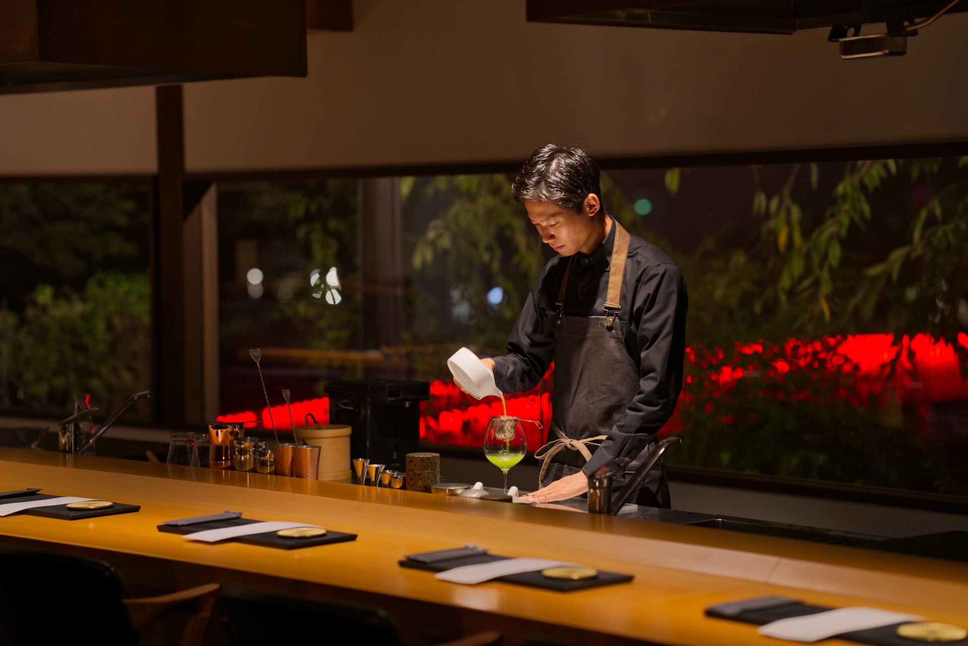 Blooming tableで咲き誇る約8,000本の花と、抜根されたお茶の木を鑑賞しながら、嬉野の人気バー「Chaya JIRO the BAR」のお茶をお楽しみいただけます。松本光氏が創造するBlooming table 。土台となる茶の木は、通常植え替えのために抜根され、廃棄されるものです。約40年の役目を終えた茶の木の枝脈や苔をご覧いただきながら、歴史を感じ、味わい深い一杯をお愉しみください。