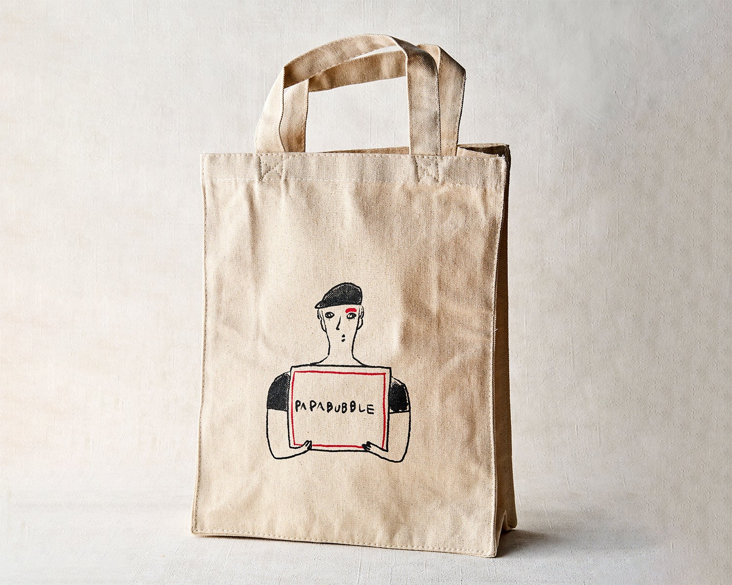 オープンを記念し、商品をご購入いただいたお客様を対象に、各日先着100名様に「オリジナルトートバッグ」をプレゼントいたします。バッグのデザインには、キャンディ職人のイラストをあしらい、厚手のキャンバス地を使用。パパブブレでのお買い物用エコバッグとしてはもちろん、日常使いにも適した実用性の高いアイテムです。