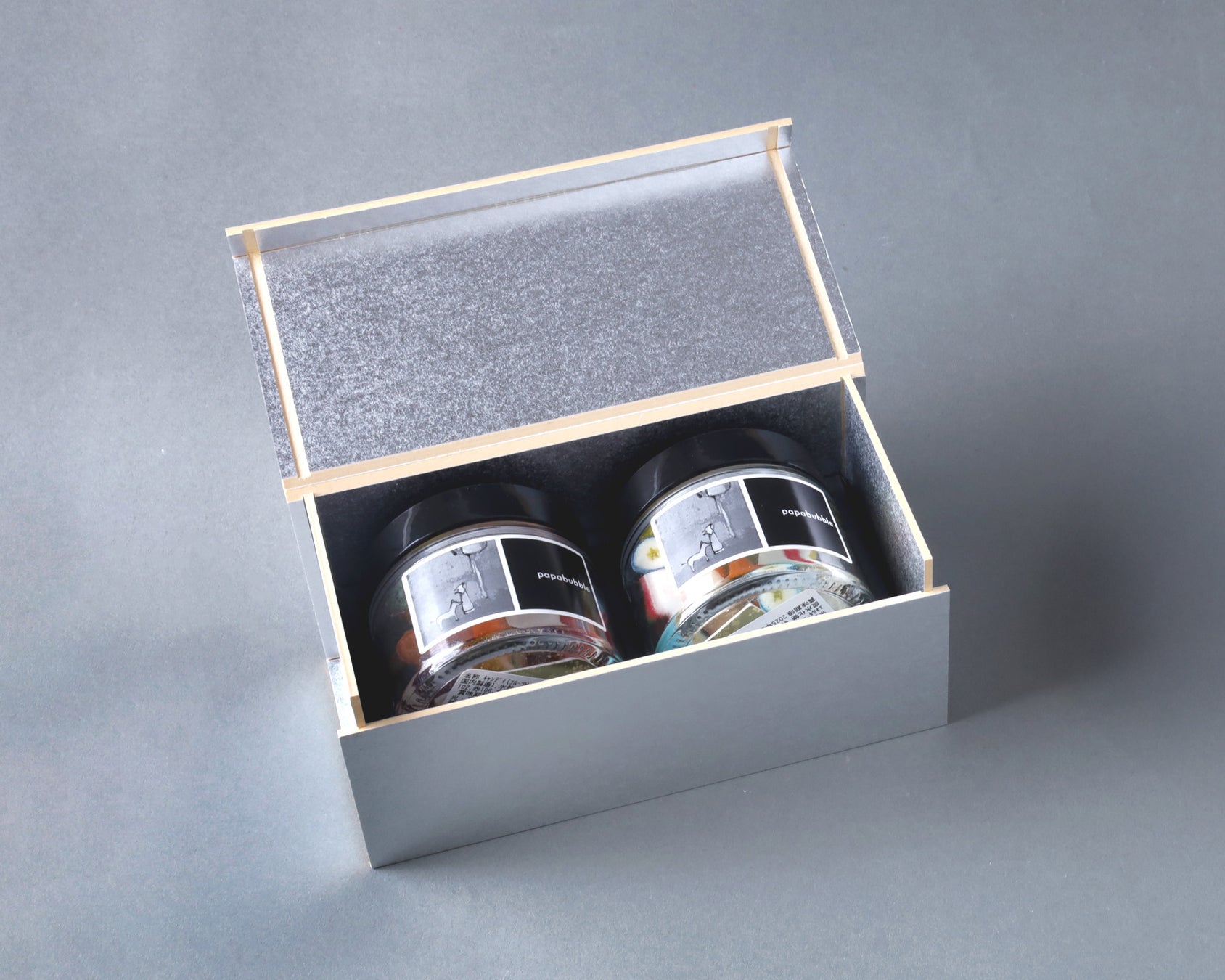 高級感あふれるシルバーのボックスにご用意したのは、人気のバブレッツを詰め合わせた「バブレッツギフト」と、フルーツミックス・サンキューミックスのSJARを2個セットにした「SJARギフト」の2タイプです。お祝いや大切な方への贈り物にも最適です。