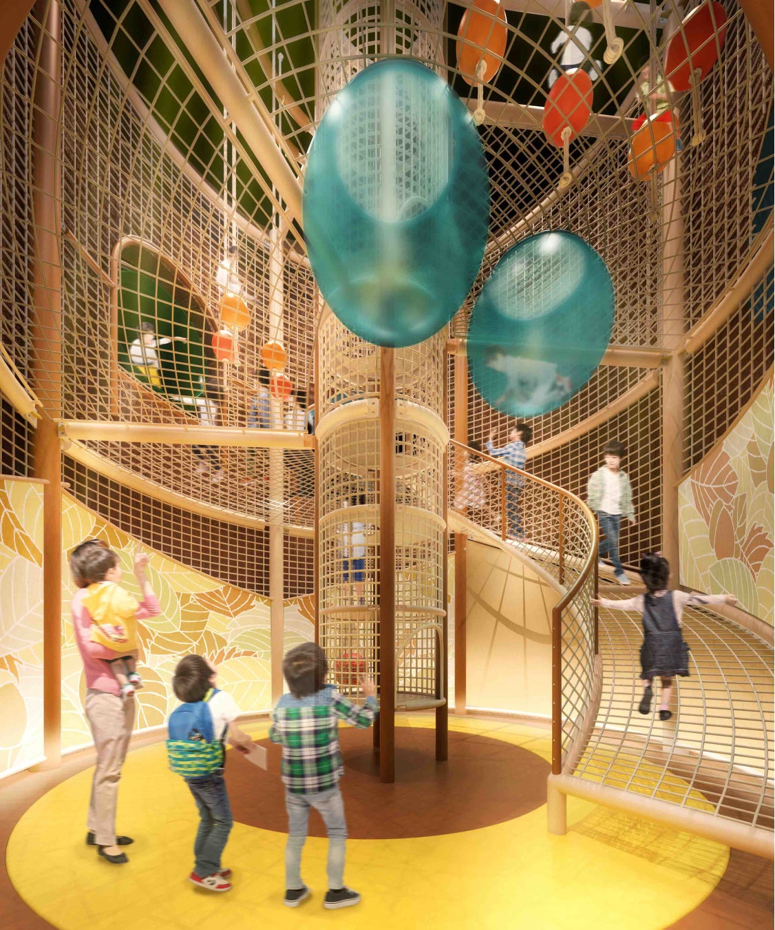 シンボルは入ってすぐ目にとまる大きな「はじまりの木~ジャイアントツリー~」。秘密基地のような大樹の中にはボールブランコやネットスロープが張り巡らされていて、木の中を探検しているようなアスレチックを楽しめます。