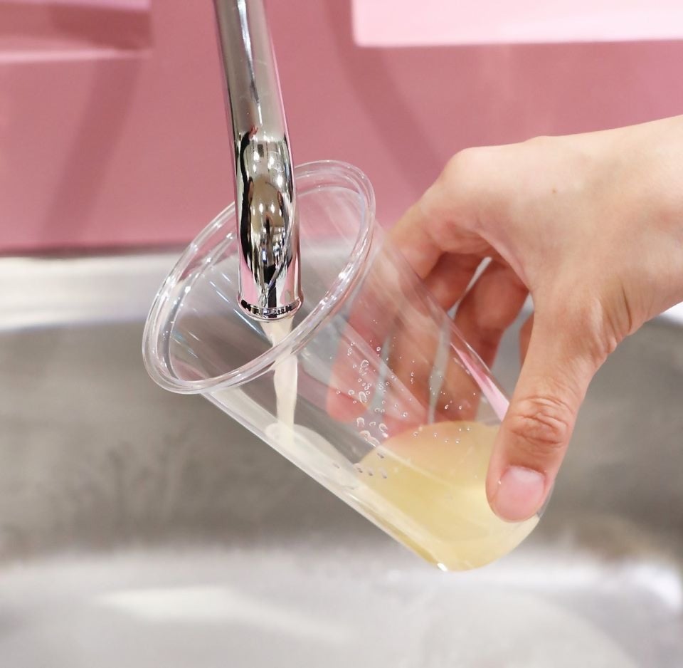 まるで夢のよう!蛇口をひねって注ぐ、濃厚な白桃ジュース
