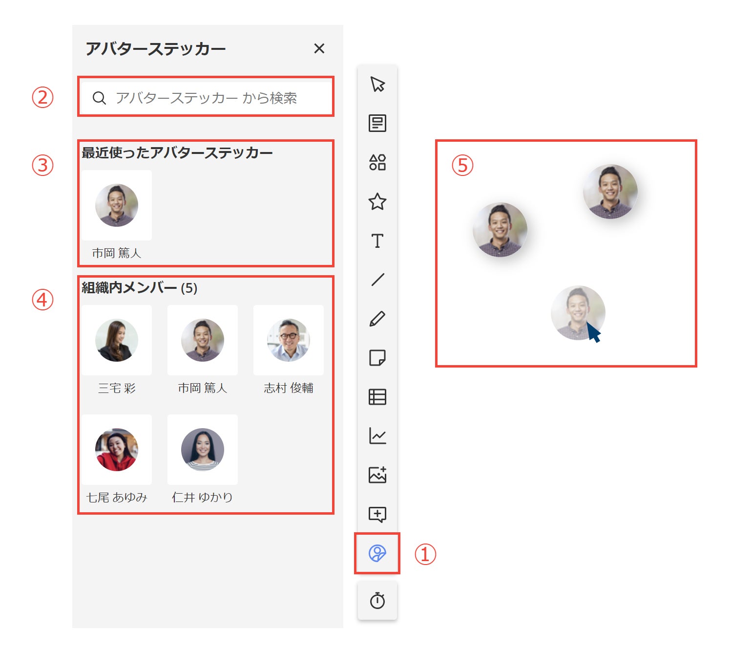 今回新たにリリースした「アバターステッカー機能」を使用することで、チームメンバーがヌーラボアカウントに登録しているアイコン画像を簡単に図に挿入することができるようになります。意志疎通がしづらいオンラインミーティング中でも、チームで出し合ったアイデアや意見に、メンバーのアイコンを添えて使用したり、チームメンバー表や座席表、プロジェクト関係者のアイコン付き一覧で作成する際等の活用場面を想定しています。