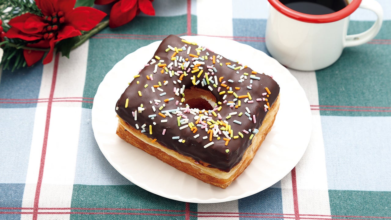 クロワッサンのようなサクッとした食感のドーナツに、ホイップクリームをサンド。上からチョコをかけ、カラースプレーをトッピングして彩り豊かに仕上げた、この季節にふさわしいスイーツです。