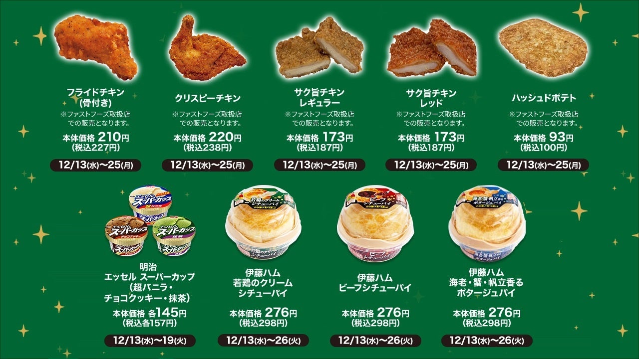 対象期間中、お店で揚げたお惣菜・ホットスナックのチキン各種やハッシュドポテト、明治「エッセル スーパーカップ」各種、伊藤ハム「シチューパイ」各種をお買い上げいただくと、1個ご購入ごとに、Pontaポイントまたはdポイントを+10ポイント進呈します。