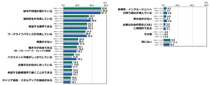 給与や待遇が優れている 52.6% / 福利厚生が充実している 35.7% / 希望する業界である 33.2%