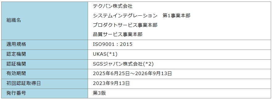 テクバン株式会社(本社:東京都港区、代表取締役 社長執行役員:高松 睦夫※、以下テクバン)の品質サービス事業本部は、このたび品質マネジメントシステムに関する国際規格「ISO9001」の認証を新たに取得しましたので、お知らせいたします。