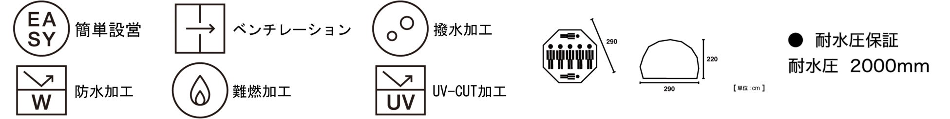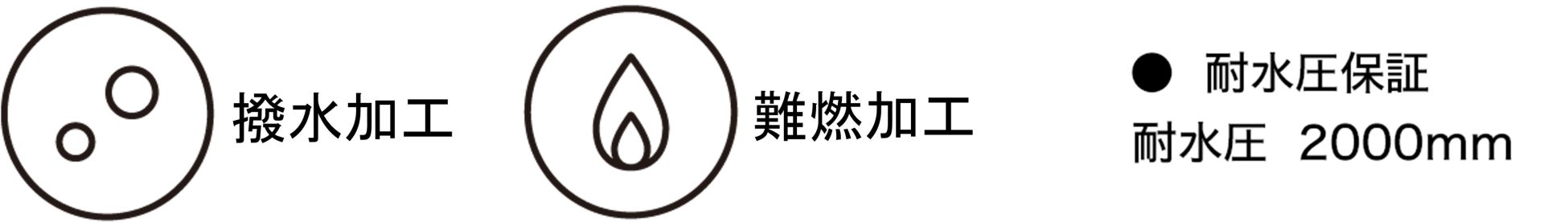 性能・難燃加工、UV-CUT、耐水圧2000mm、撥水加工