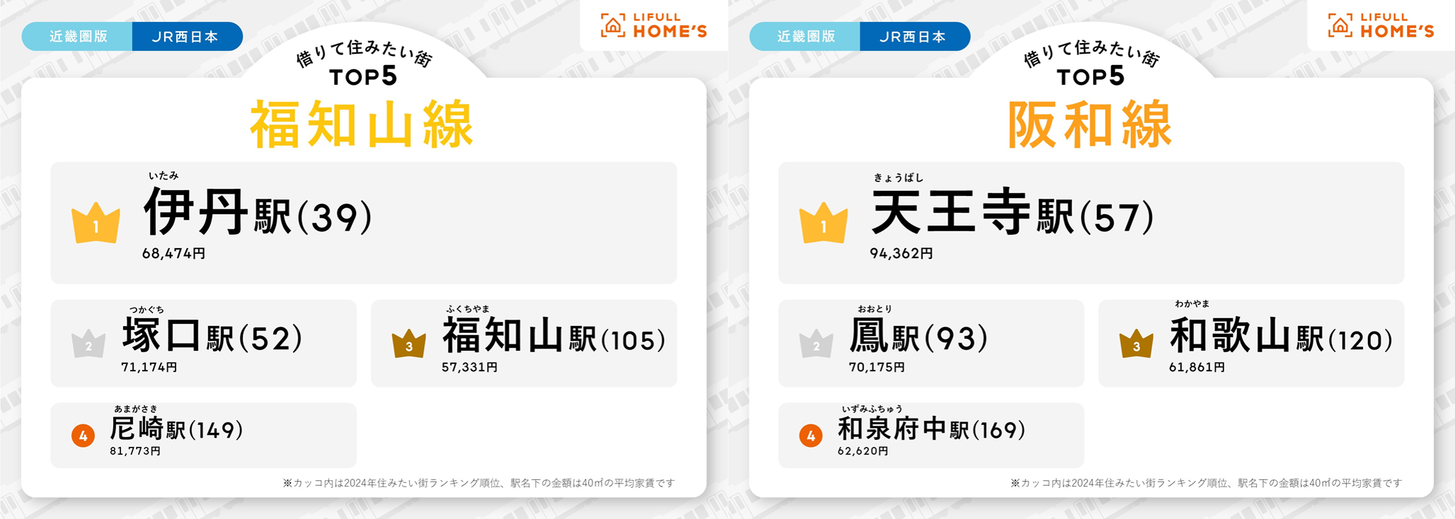 「住みたい街が多いJR西日本・近畿圏の鉄道路線ランキング」でTOP5にランクインした路線ごとの街(駅)ランキングは以下のとおりです。