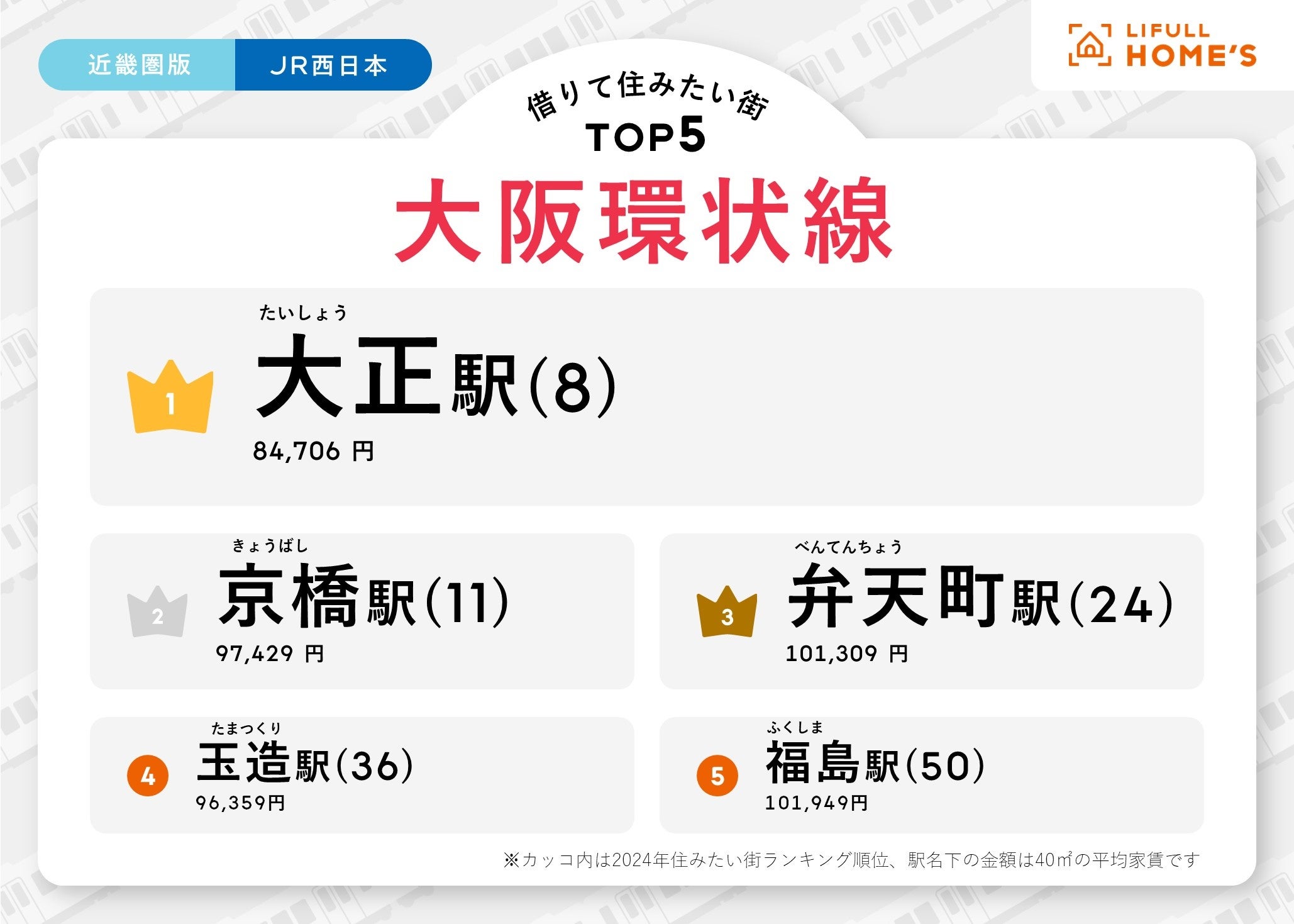 1位「大正」(大阪市大正区)は、大正区にある唯一の駅で、「大阪」まで約12分です。大阪環状線のほか、Osaka Metro長堀鶴見緑地線の終着駅で、大阪市内を走る大阪シティバスも利用可能です。阪神なんば線「ドーム前駅」も徒歩圏内で複数路線利用できます。また、オリックス・バファローズの本拠地である京セラドーム大阪の最寄り駅で、野球の試合やコンサートが開催される日は賑わいます。平均家賃が8.4万円で、駅周辺には、下町風情が感じられる街並みで大型商業施設やホームセンター、業務スーパーがあり生活費をできるだけ抑えたい人には向いている街です。2位「京橋」(大阪市城東区)は、JR東西線や片町線、京阪本線、Osaka Metro長堀鶴見緑地線が集まるターミナル駅です。「大阪」まで6分、「心斎橋」まで12分でアクセスでき、和歌山や兵庫、奈良や京都など他府県へにもアクセスしやすいです。駅周辺は、商業施設や商店街、スーパーをはじめ、ビジネス街の大阪ビジネスパークにも近いため飲食店も豊富です。さらに大阪城公園も徒歩圏内で、歴史や文化だけでなく、公園内の豊かな自然を感じられる街です。3位「弁天町」(大阪市港区)は、「大正」の隣で「大阪」まで7分です。Osaka Metro中央線も利用でき、大阪の中心部まで乗り換えなしでアクセスできます。駅周辺には、区役所や図書館などの公共施設、ホームセンターや総合ディスカウントストアがあり、徒歩圏内に生活に必要な施設が揃う街です。4位「玉造」(大阪市天王寺区)は、Osaka Metro鶴見緑地線も利用でき、「京橋」「大阪ビジネスパーク」「心斎橋」「ドーム前千代崎」などを通ります。ホームセンターや深夜まで営業するスーパー、商店街があります。静かで大きな公園もありファミリー層も多いため、大阪市内で落ち着いて暮らしたい方に向いている駅です。5位「福島」(大阪市福島区)は、「大阪」の隣駅で、徒歩圏内にJR東西線「新福島」と阪神本線「福島」があります。JR福島駅周辺は、都会的な雰囲気と個人商店などどこか懐かしく、食の街としても名高く、こだわりのお店が集まるエリアです。駅から少し歩くとマンションや公園があり、住みたい街としても人気です。
