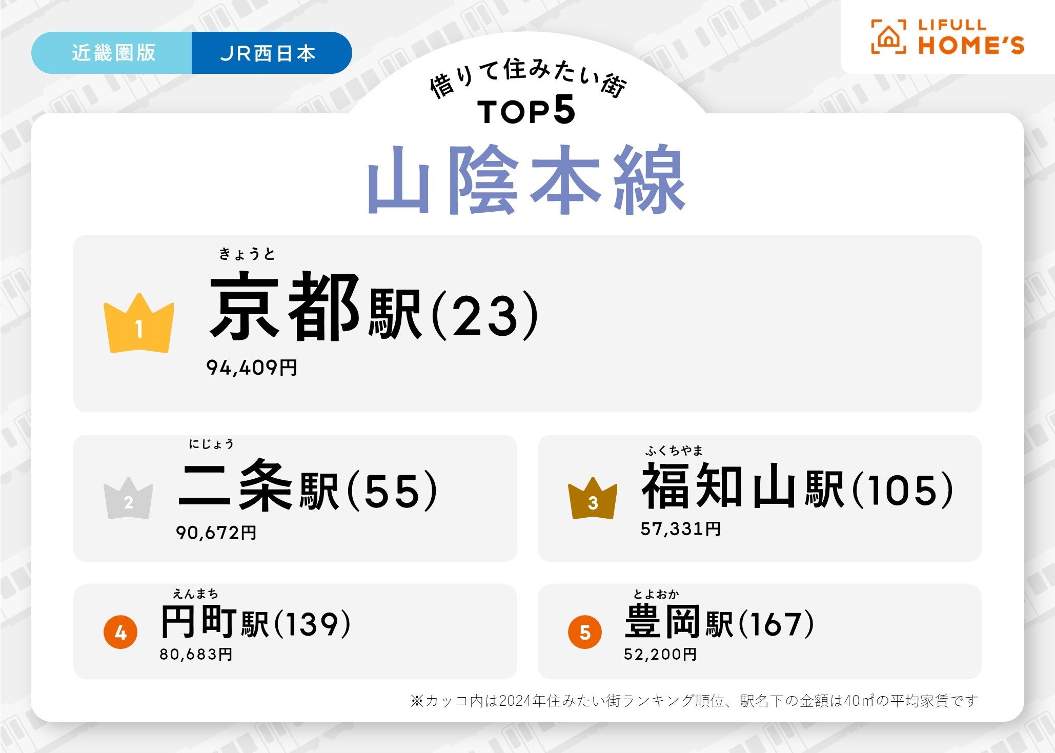 「住みたい街が多いJR西日本・近畿圏の鉄道路線ランキング」の3位は山陰本線です。山陰本線における住みたい街1位は「京都」(借りて住みたい街ランキング近畿圏版23位、2位「二条」(同55位)、3位「福知山」(同105位)、4位「円町」(同139位)、5位「豊岡」(同167位)となりました。山陰本線は、TOP200内に5駅がランクインしています。「京都」から山口県下関市まで繋がる山陰本線、近畿圏では日本海側を経由し「居組」までを結びます。沿線には、二条城や京都鉄道博物館、東映太秦映画村など、京都を代表する観光スポットが点在しています。