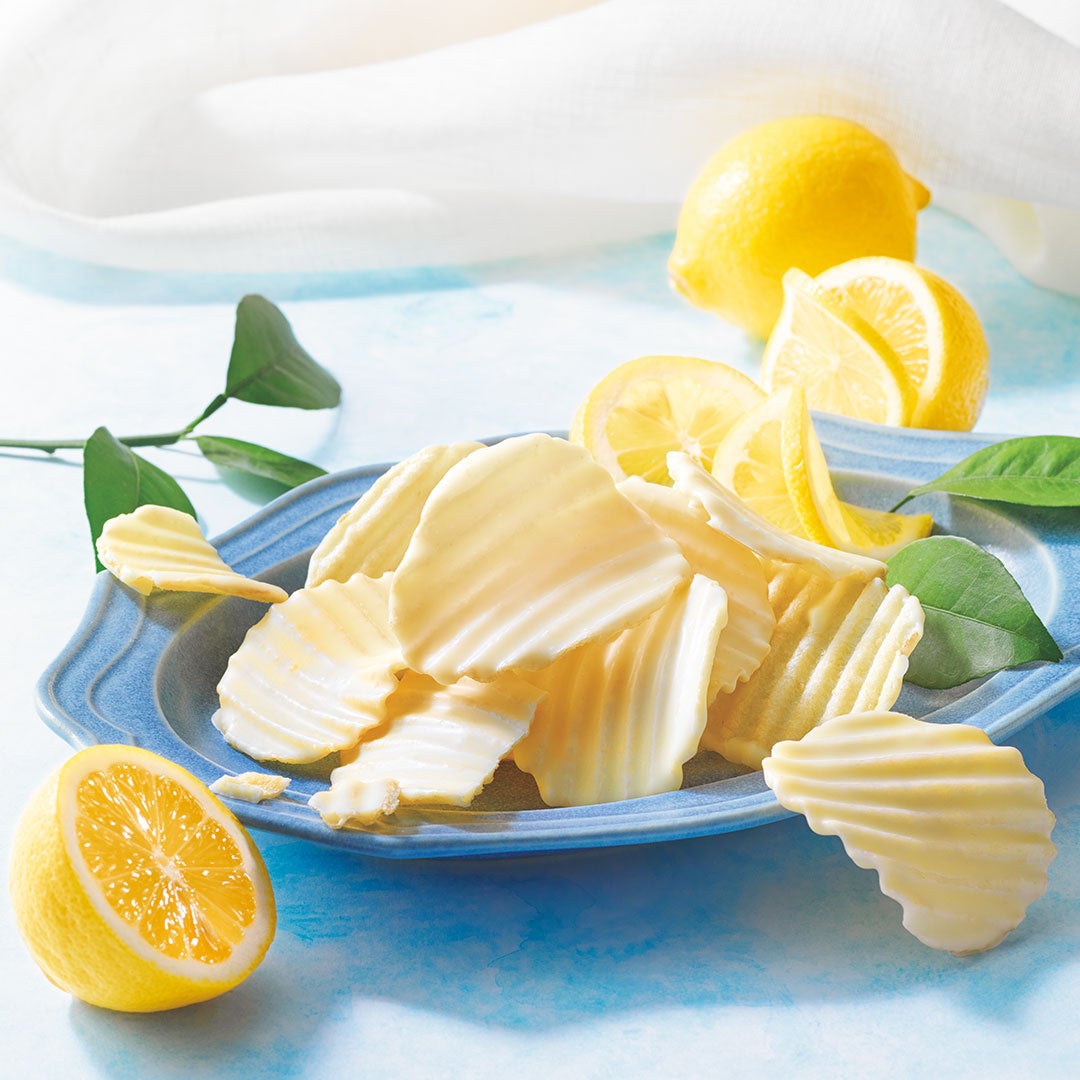 さわやかな酸味が特長のレモンチョコレートをポテトチップの片面にコーティング。レモンの味わいが引き立つよう、レモンチョコレートにはチーズ風味・ヨーグルト風味のチョコレートを隠し味に加えています。レモンのさわやかな香りと酸味、ポテトチップの塩味がひとつになって塩レモンを思わせる、夏に食べたいさっぱりとした味わいです。