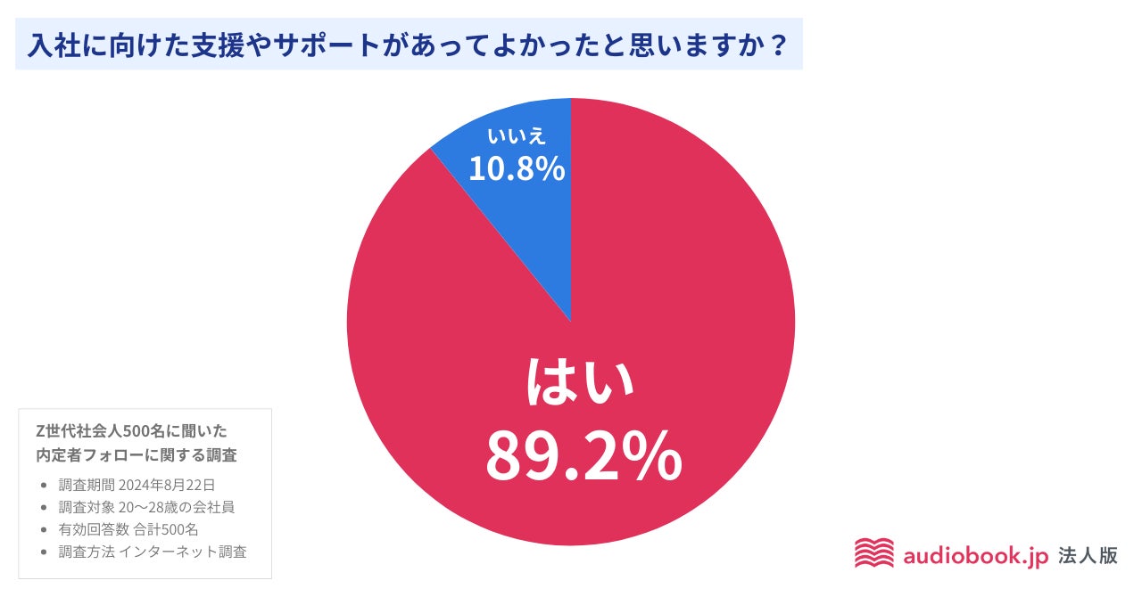 内定者フォローがあったと答えた方に、入社に向けた支援やサポートがあってよかったか問うと、89.2%が「はい」と回答。内定を受けた企業からのフォローについて、Z世代社会人の多くは好意的に感じているようです。