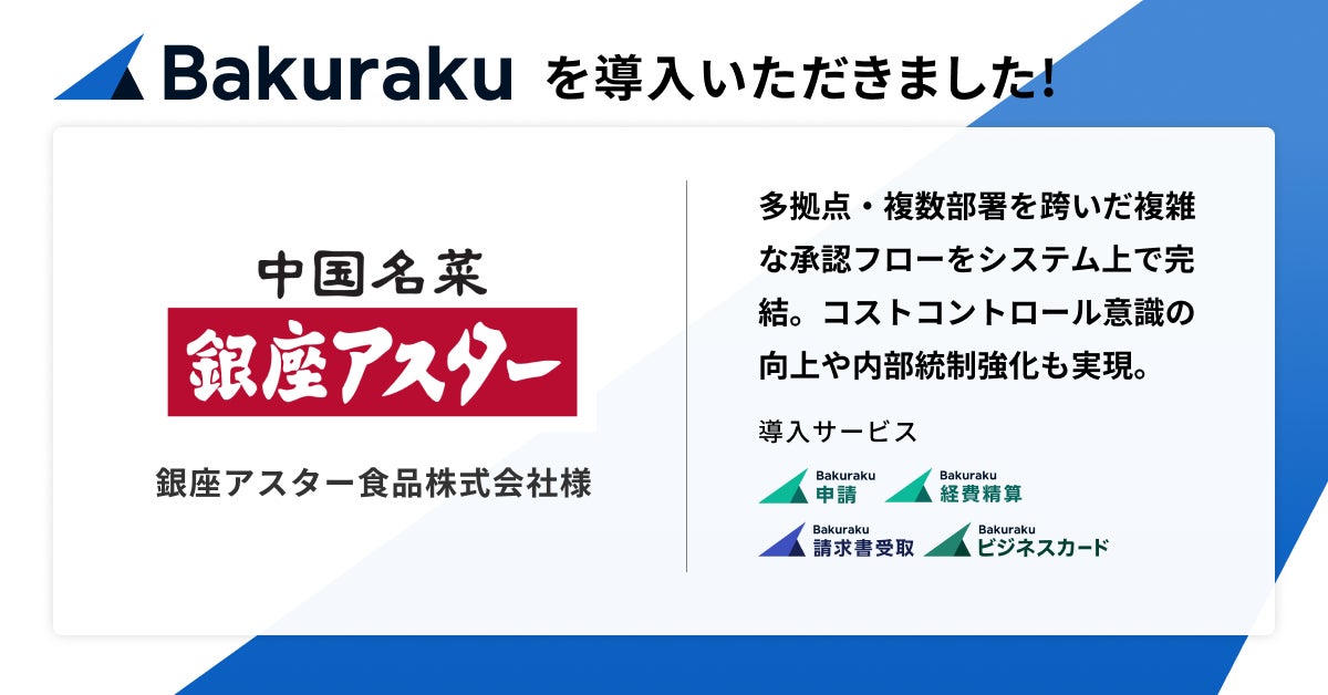 この度、老舗中国料理レストランを手掛ける銀座アスター食品に「バクラク申請」「バクラク経費精算」「バクラク請求書受取」「バクラクビジネスカード」が導入されました。