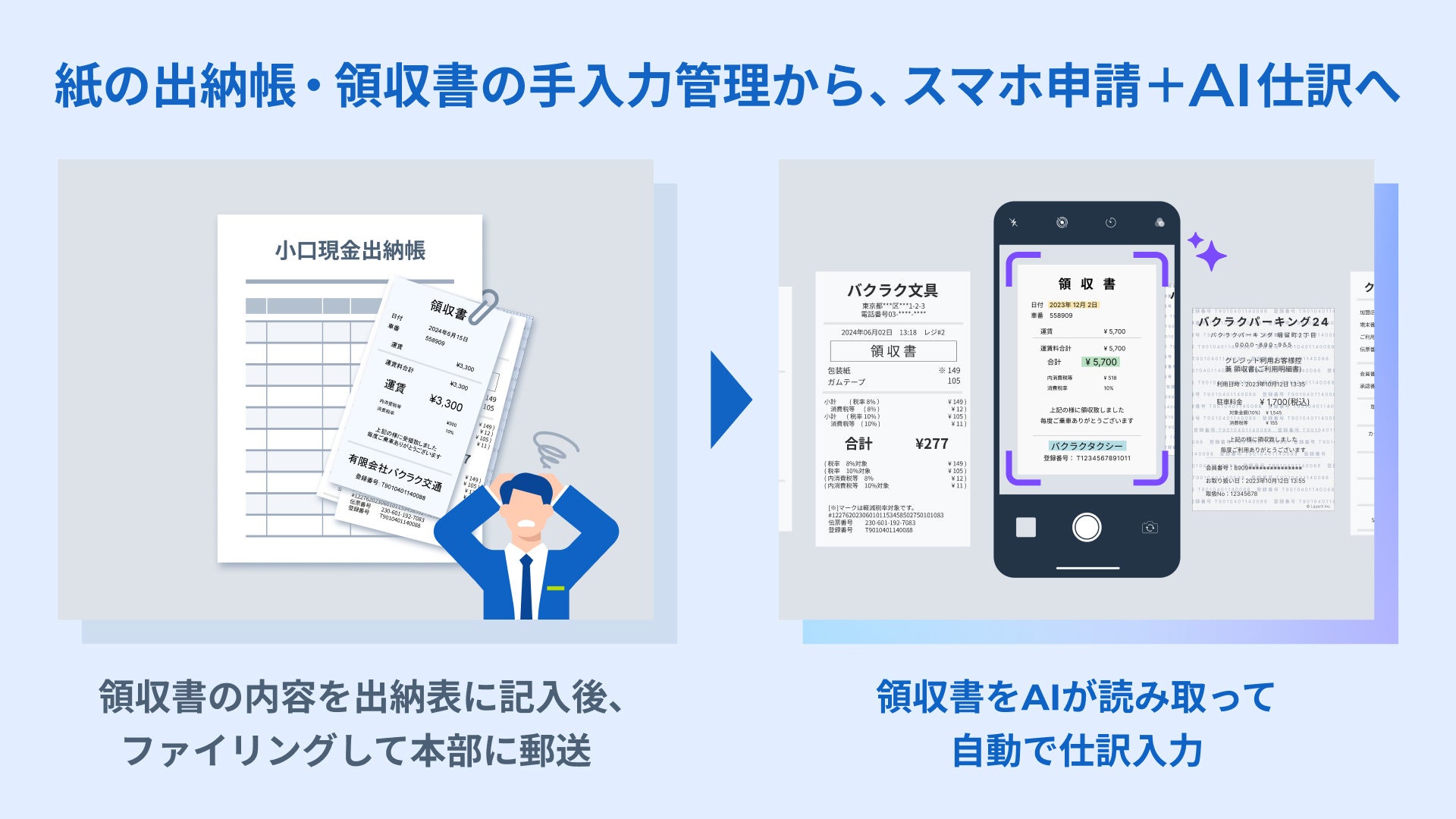 従来の運用では、スタッフ不足時に他店舗からヘルプを呼ぶ際発生する「応援交通費」や、日々発生する備品購入等について、店舗スタッフが紙の小口現金出納帳や出金伝票に用途・金額を手入力し、本部で領収書とつき合わせて目視・手作業で確認していたことによる人為的なミスが課題となっていました。